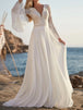 Captura el encanto bohemio con nuestro vestido de novia con mangas de murciélago estilo bohemio. Este vestido de corte A hasta el suelo presenta un escote en V, mangas de murciélago amplias y una cola amplia. Está hecho de gasa con detalles de encaje y un diseño con aberturas, tiene una cremallera en la espalda, un sujetador incorporado y se puede personalizar para un ajuste perfecto. Adecuado para mujeres embarazadas, es la opción ideal para un look nupcial de espíritu libre.