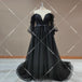 Elegante vestido de novia negro con escote en V y mangas abullonadas. Esta silueta en forma de A hasta el suelo presenta un diseño sin espalda, tela de tul y detalles de encaje. Incluye una cola amplia, sujetador incorporado y opciones personalizables con cintura natural para un look de novia sencillo pero llamativo.