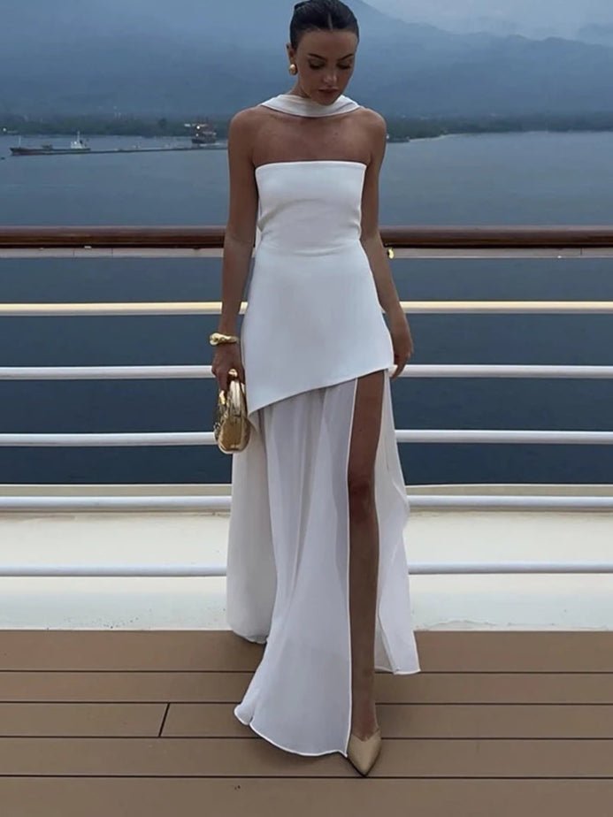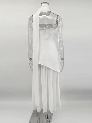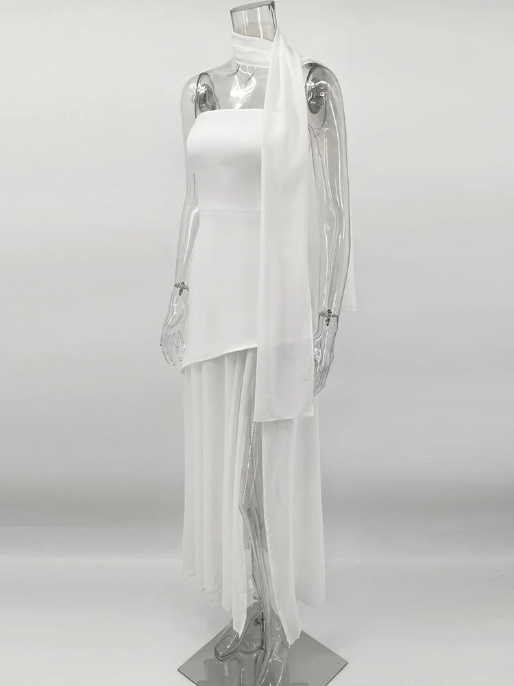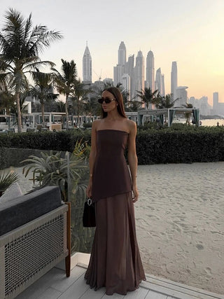 Design: A fashionable, strapless mesh dress featuring patchwork details, designed to add a touch of edginess. The ankle-length silhouette and straight fit enhance the sleek, modern look, while the sleeveless style keeps it light and airy.