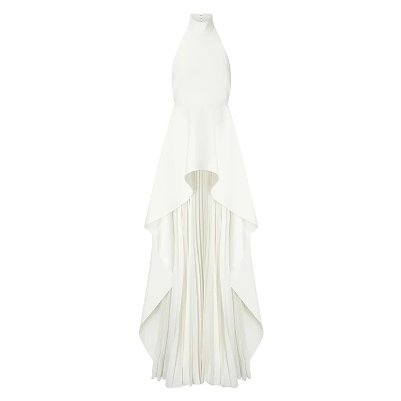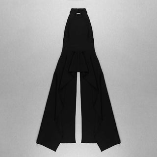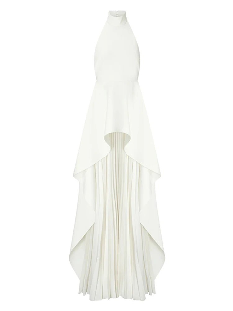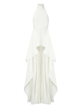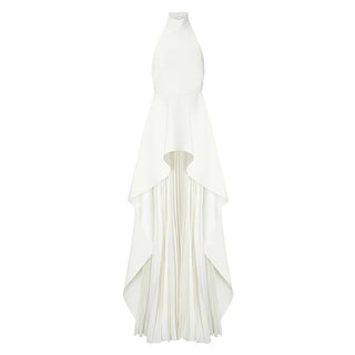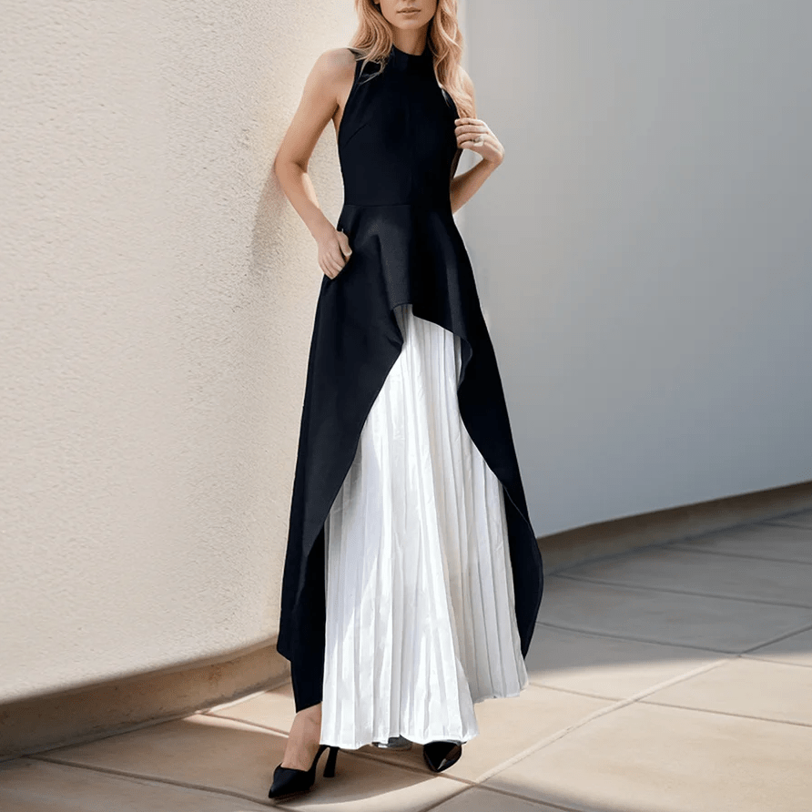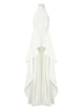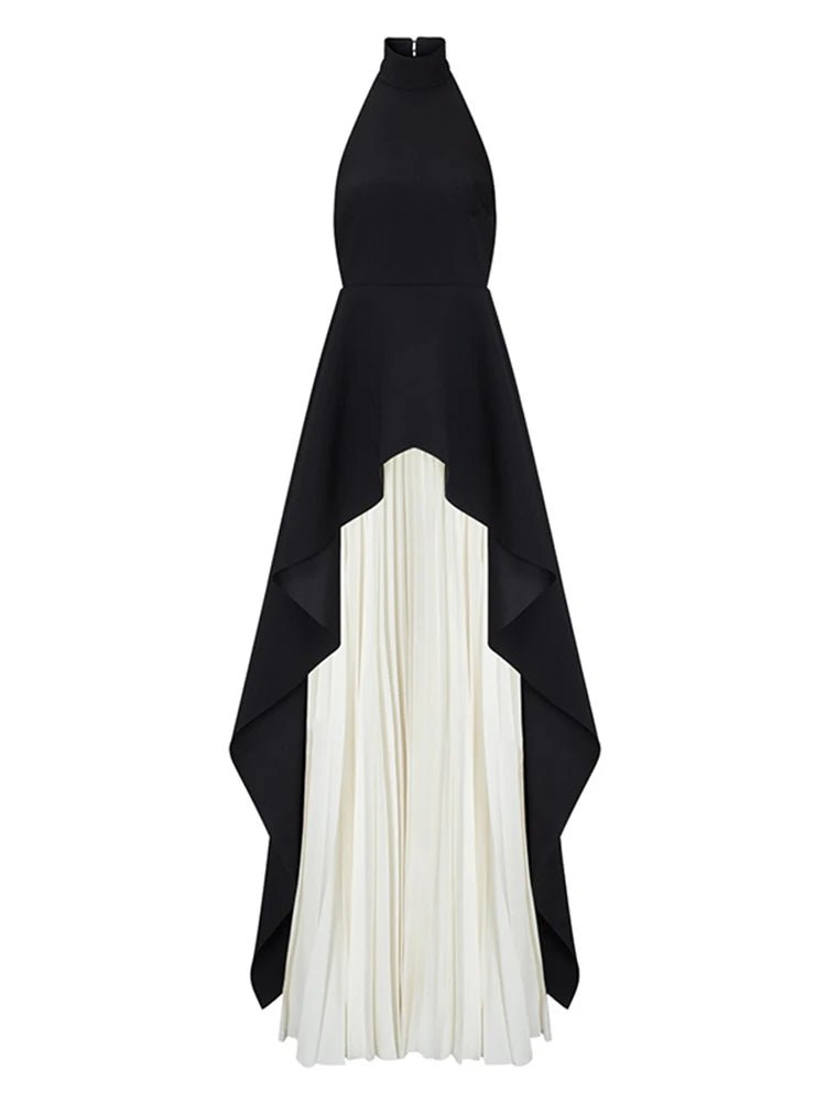 Design: A sophisticated halter neck dress with a backless design, featuring an A-line silhouette that flows elegantly to ankle length. The loose fit offers a relaxed and flattering look, ideal for office or formal occasions.
