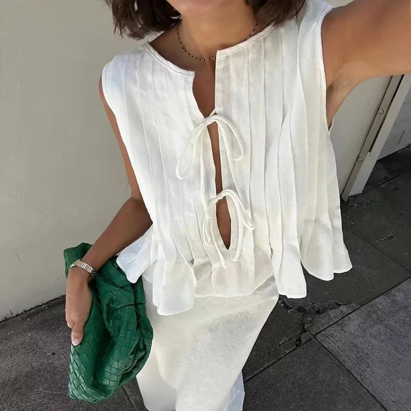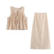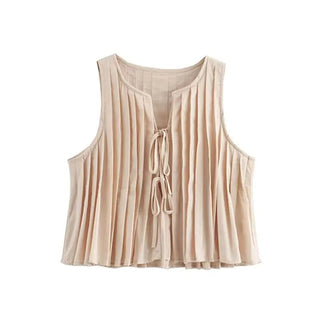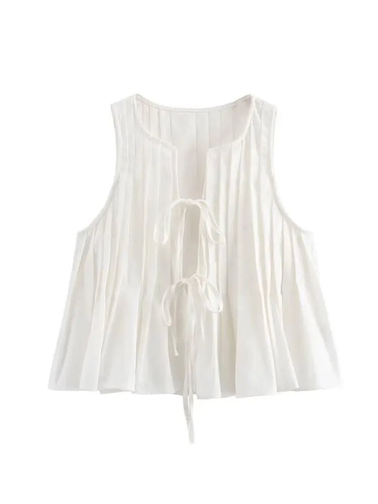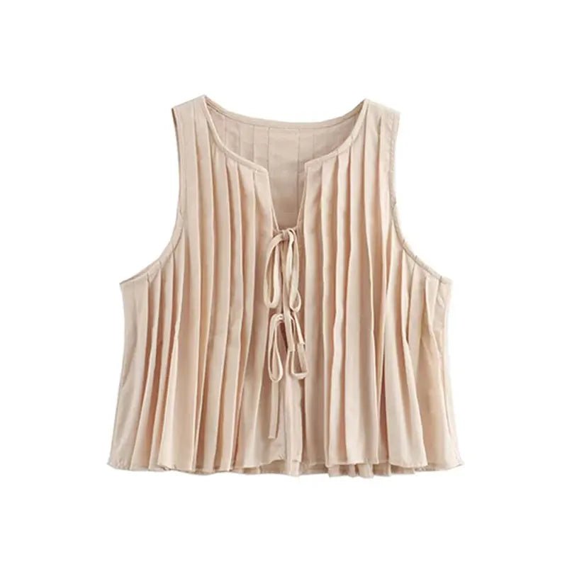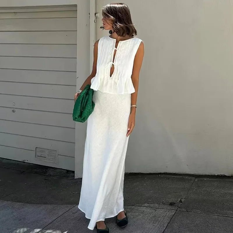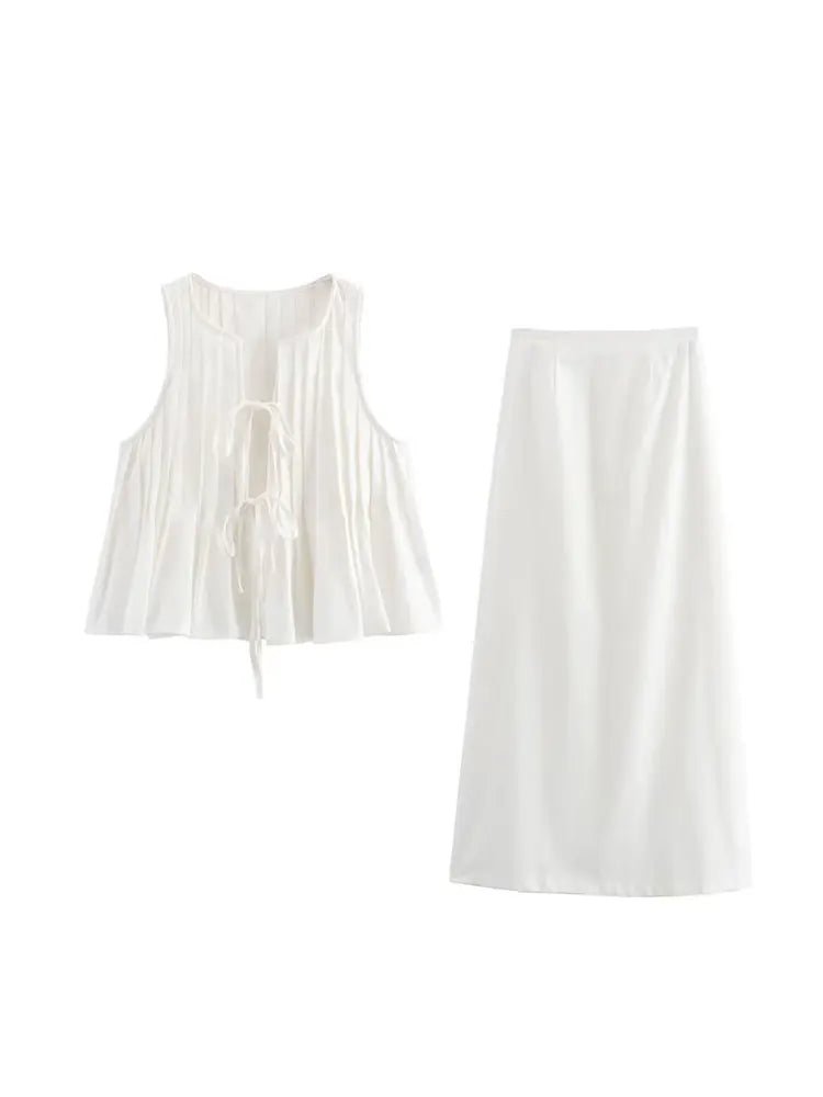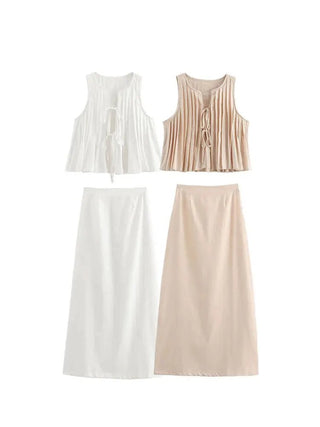 Design: A chic two-piece set featuring a lace-up pleated midi skirt and a matching sleeveless top. The slim-fit silhouette and delicate folds add an elegant yet casual touch, perfect for versatile styling.