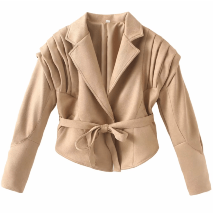 Abrigo de cuero de estilo urbano con escote en V y detalles de cordones, con elementos empalmados y fajas para un estilo adicional. Esta chaqueta de patrón liso está hecha de poliéster con un grosor estándar y tiene mangas largas, cuello vuelto y cierre de cinturón. Perfecta para un look elegante y moderno.