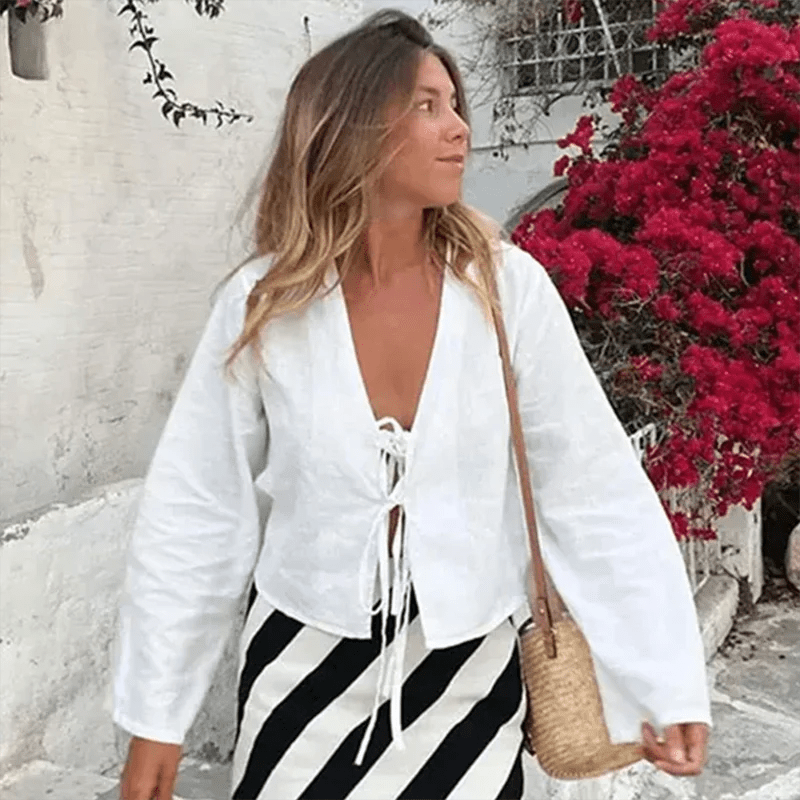 Design: A casual loose-fit shirt featuring a V-neckline, lace-up detailing, and puff flare sleeves. The lightweight cotton fabric and solid color create a relaxed, stylish look perfect for spring and summer.