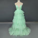 Este sencillo pero elegante vestido de novia de tul presenta un diseño de espalda abierta con escote en V y delicados tirantes finos. Con detalles en capas, frunces y pliegues, esta silueta en forma de A hasta el suelo ofrece una cola amplia y una cintura natural para un look elegante. Completo con un sujetador incorporado y opciones personalizables, es perfecto para un estilo de boda atemporal.