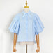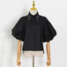 Esta camisa holgada con mangas abullonadas presenta una mezcla de algodón y poliéster con un patrón tejido de un solo color. Su corte holgado, cuello vuelto y cierre de botonadura sencilla la convierten en una opción elegante y cómoda. La tela de peso medio y los pliegues decorativos añaden un toque de estilo para una elegancia sin esfuerzo.