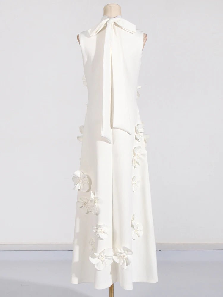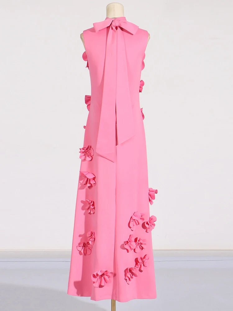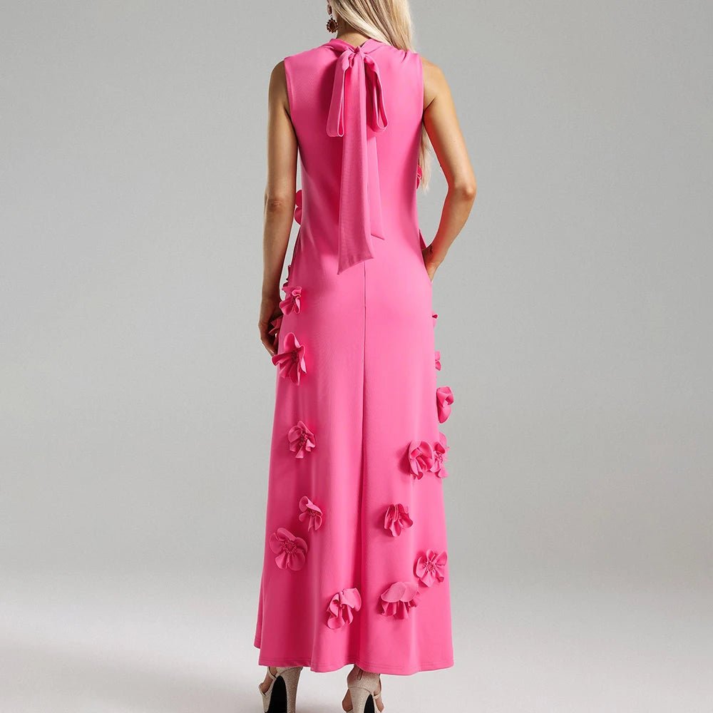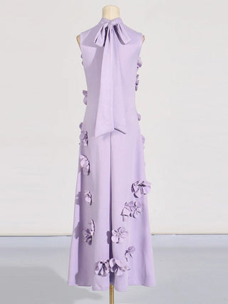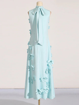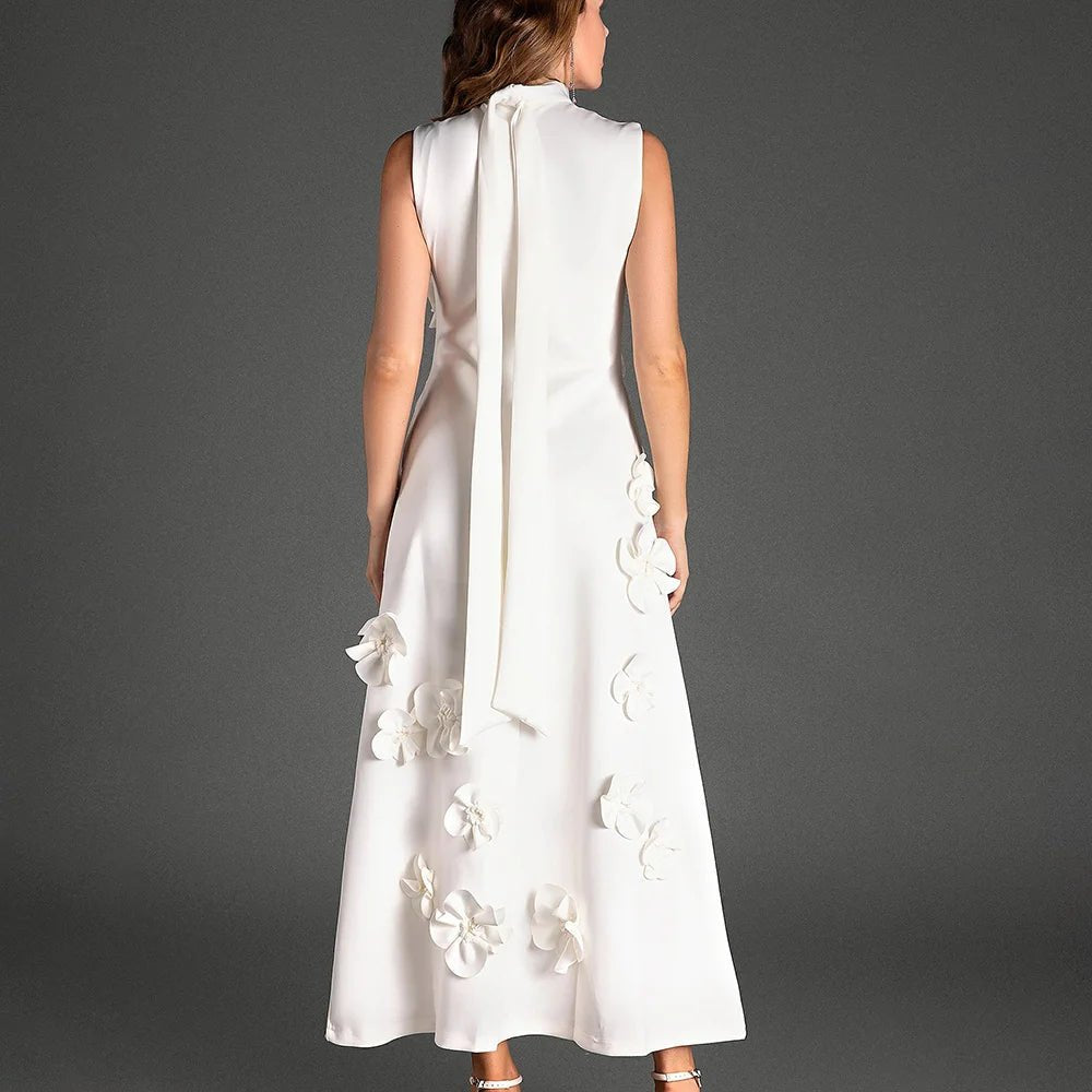 Design: A sleeveless, ankle-length A-line dress featuring a high waist and lace-up detail for a chic and flattering look. Appliques add an elegant touch to the design.