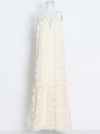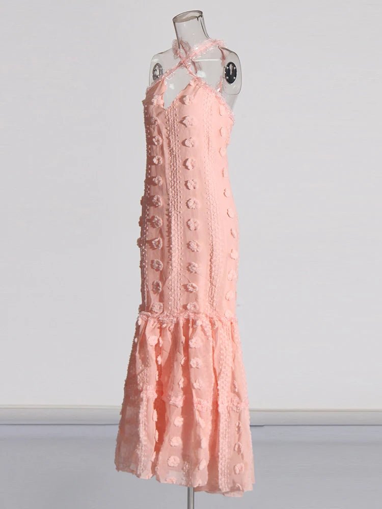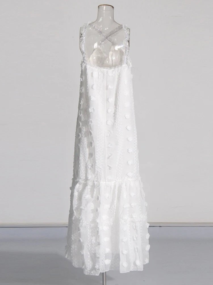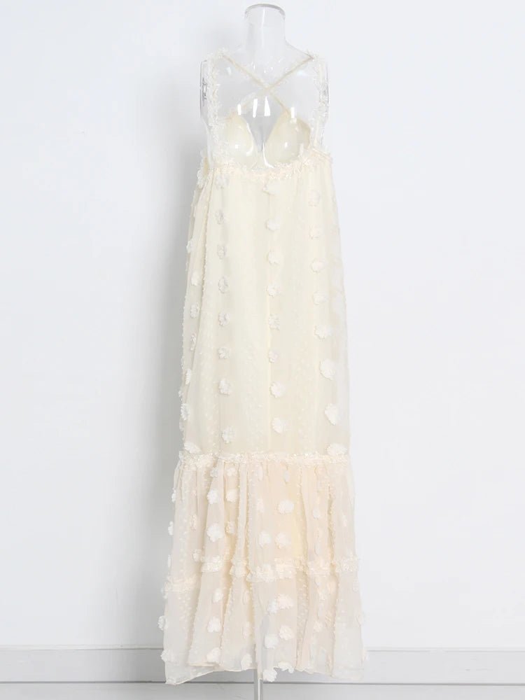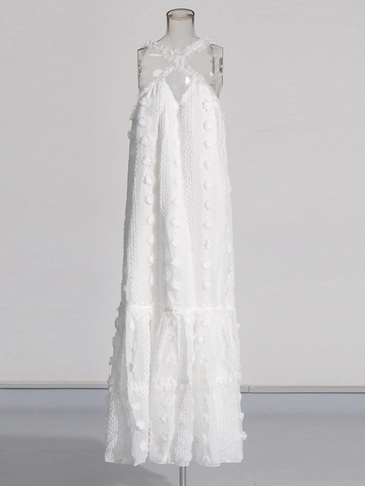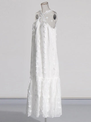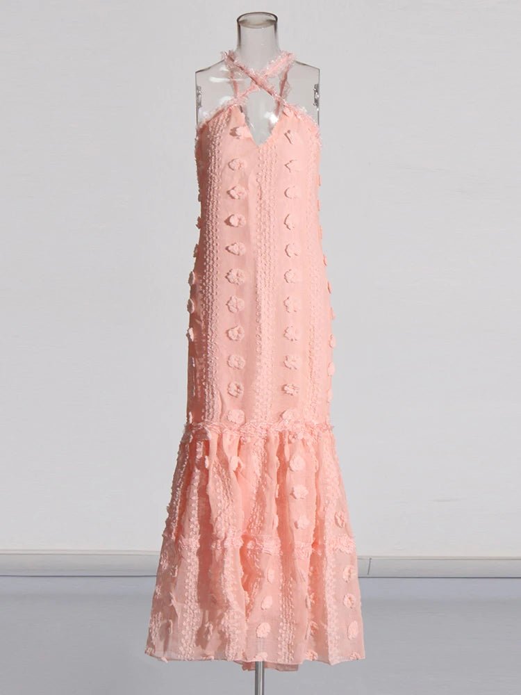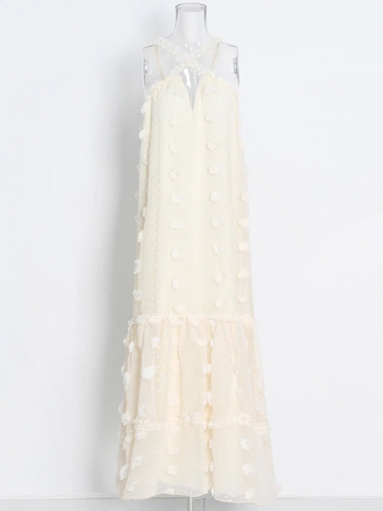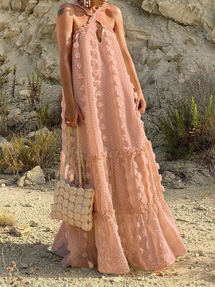 Design: A vibrant summer dress featuring a V-neck halter neckline, a sleeveless design, and an eye-catching floral patchwork. The floor-length straight silhouette offers a relaxed yet stylish look, perfect for warm-weather days.