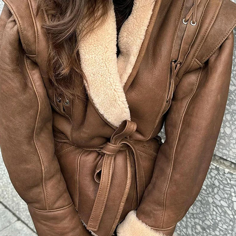 Abrigo vintage de piel sintética con escote en V y cinturón