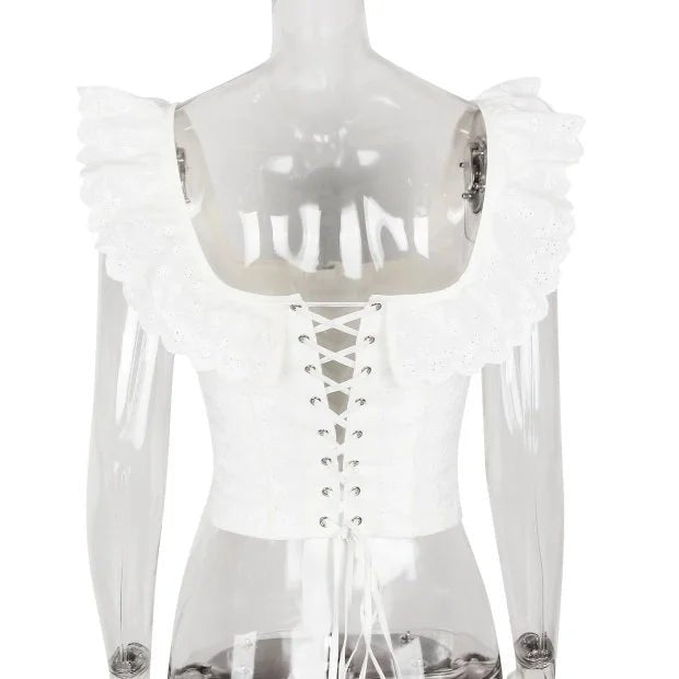 Design: A stylish summer top featuring delicate lace accents and soft ruffle detailing. This crop top offers a clean, structured look with a regular length, perfect for pairing with high-waisted bottoms.