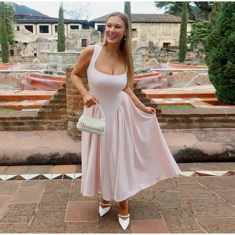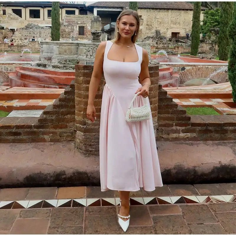 Design: A graceful ankle-length A-line dress featuring a slim fit, pleated detailing, and a timeless square neckline. The sleeveless camisole style adds modern elegance with a breezy, flattering silhouette.