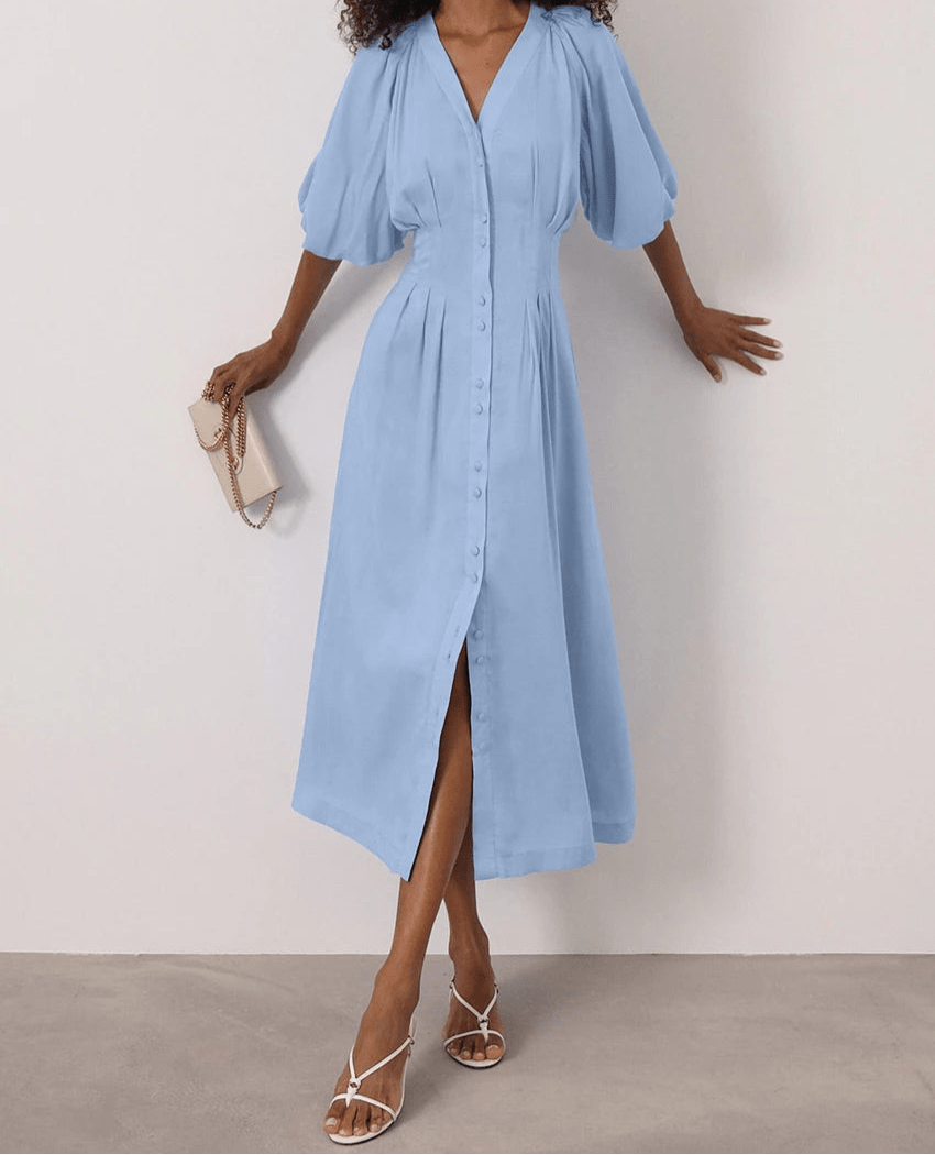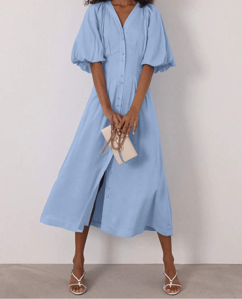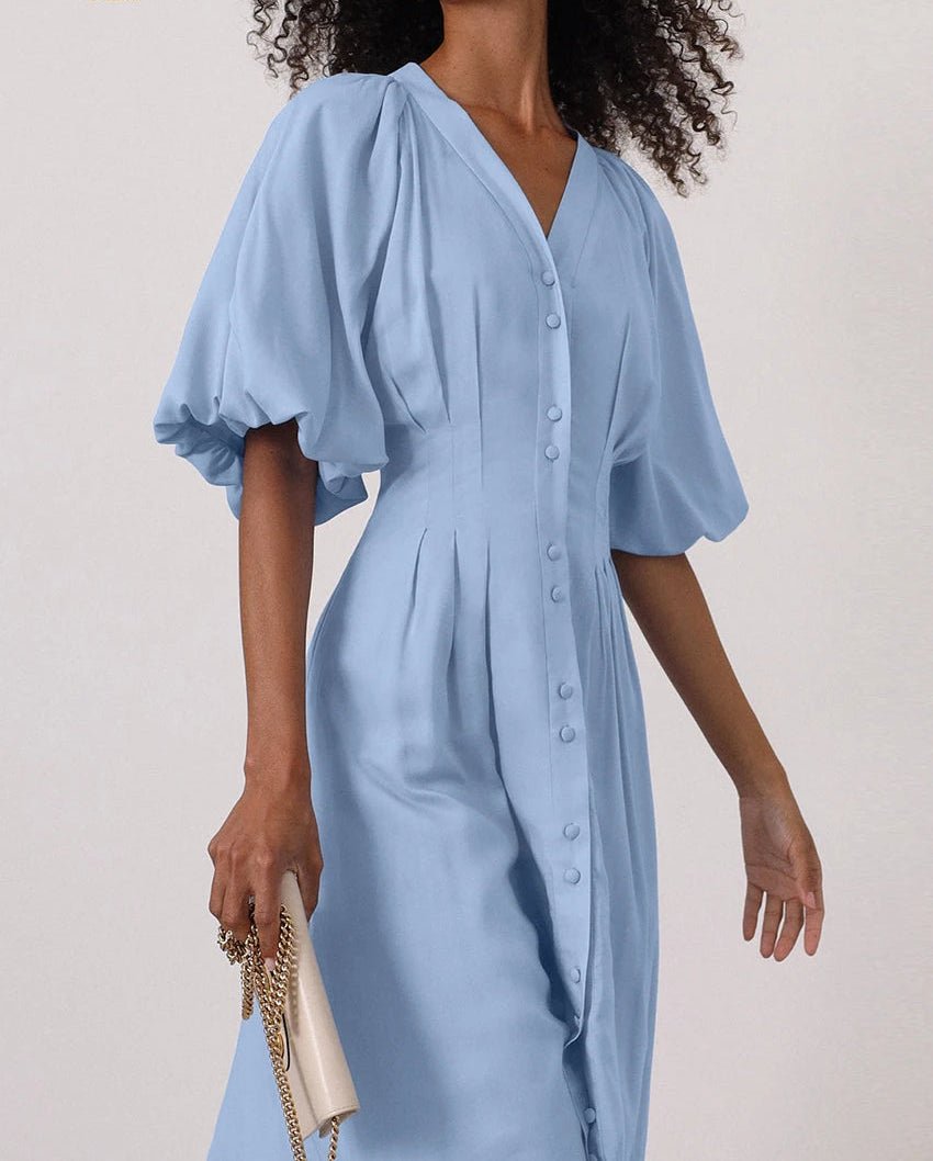 V-Neck Puff Sleeve Midi Dress