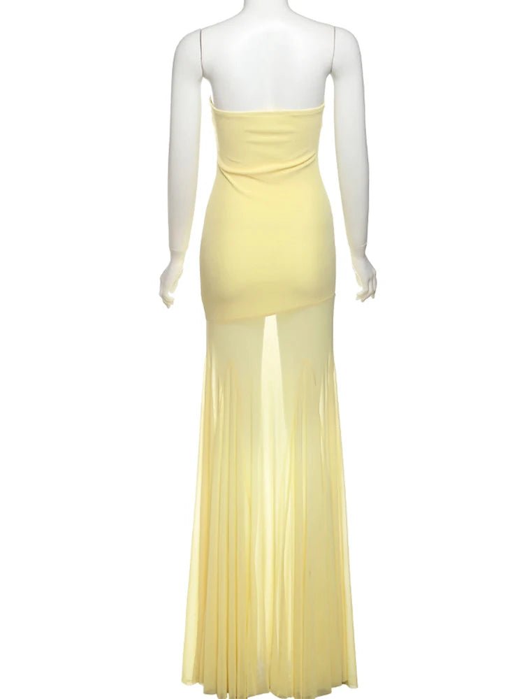 Design: An elegant ankle-length dress featuring a strapless neckline, pleated detailing, and a sleeveless, backless silhouette. Its A-line shape and slim fit offer a refined look perfect for formal settings.