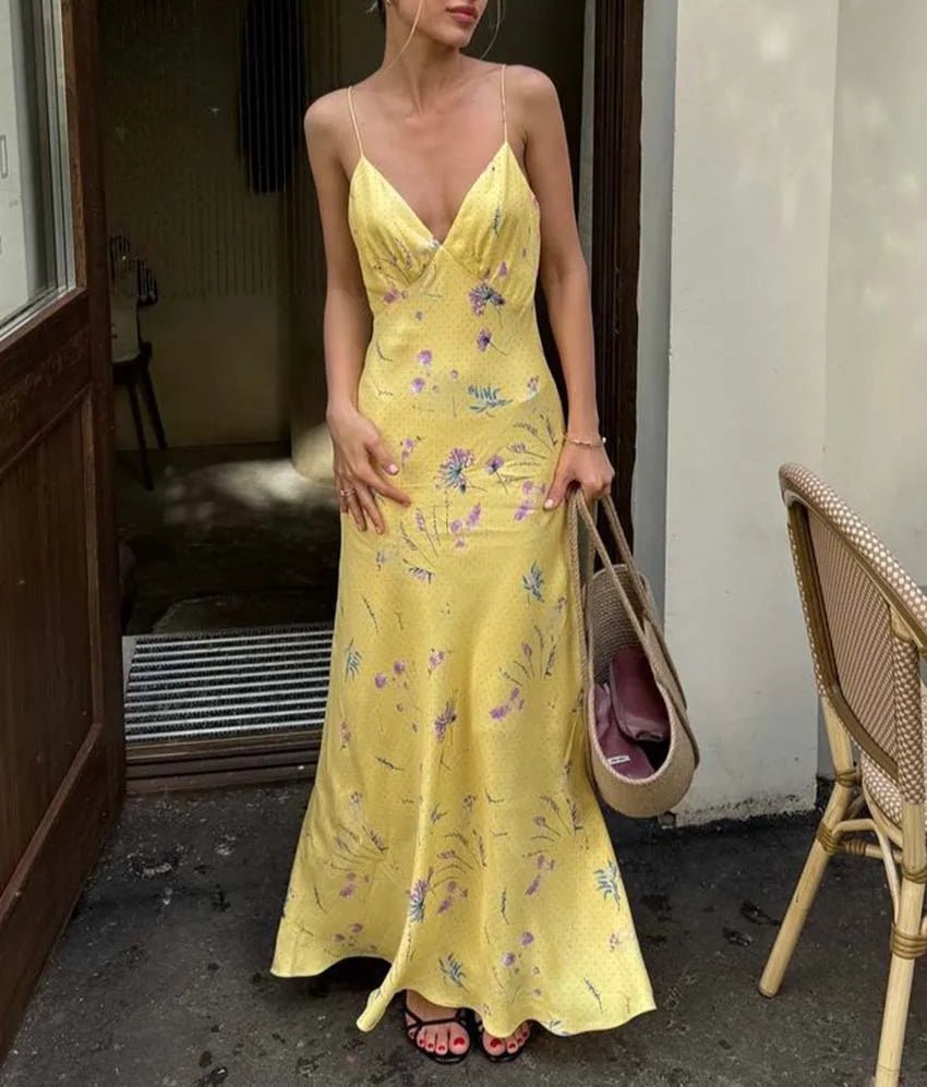 Design: Elegant ankle-length dress featuring a vibrant yellow print, V-neckline, and slim spaghetti straps. The straight silhouette offers a sleek, flattering look perfect for effortless autumn style.