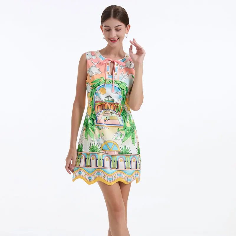 Design: A playful mini dress featuring a sleeveless tank style, charming bow neckline, and whimsical cartoon print. Its A-line silhouette and empire waist add a sweet, beachy flair perfect for sunny days.