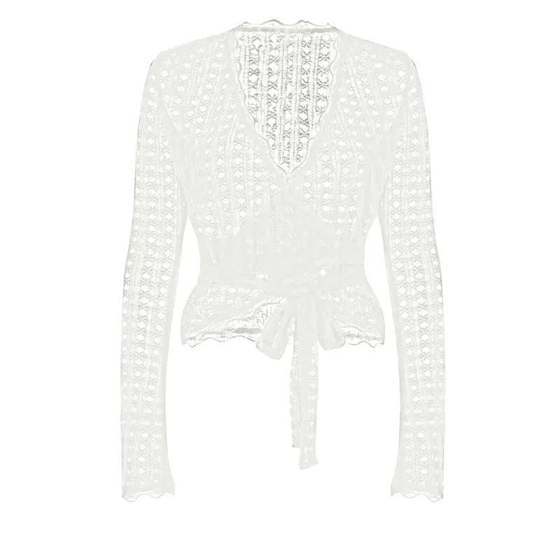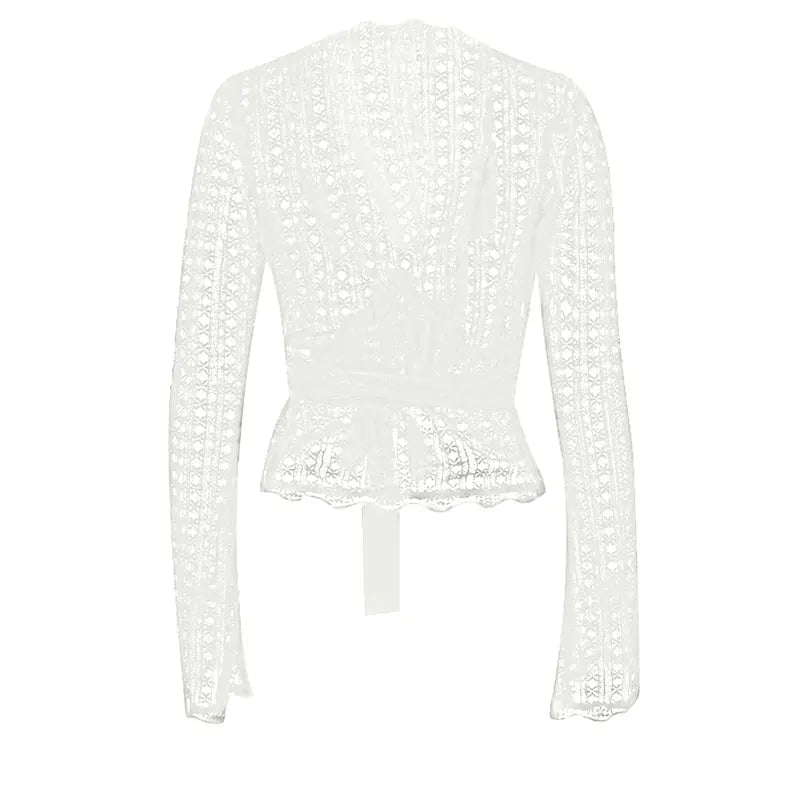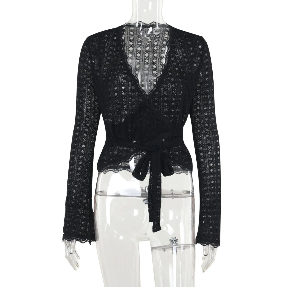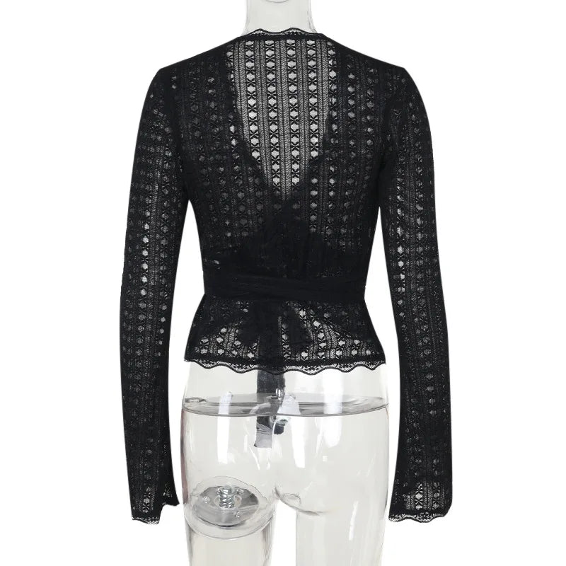 Design: A versatile long-sleeve tee featuring a delicate lace V-neckline and sheer detailing. This slim-fit top blends streetwear flair with feminine elegance, perfect for layering in cooler seasons.