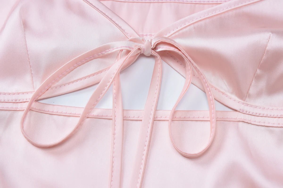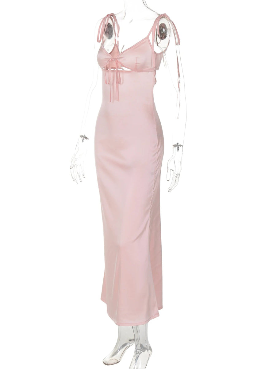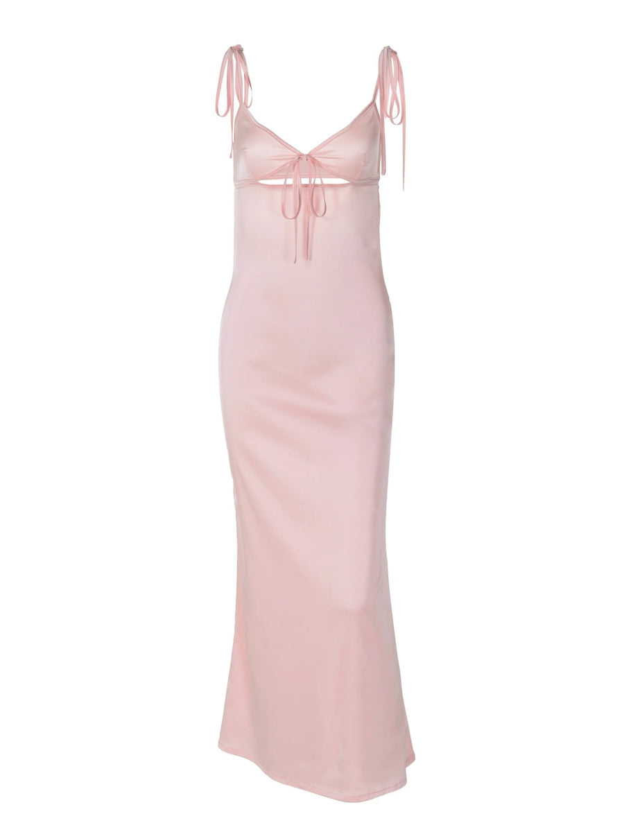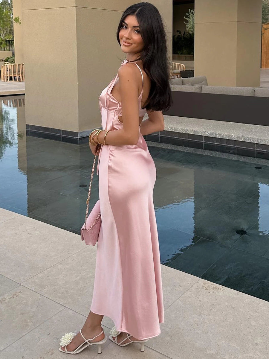 Design: A sultry summer midi dress featuring a flattering V-neckline, lace-up backless detail, and bold cut-outs. The A-line silhouette and spaghetti straps add to its flirty, feminine appeal.