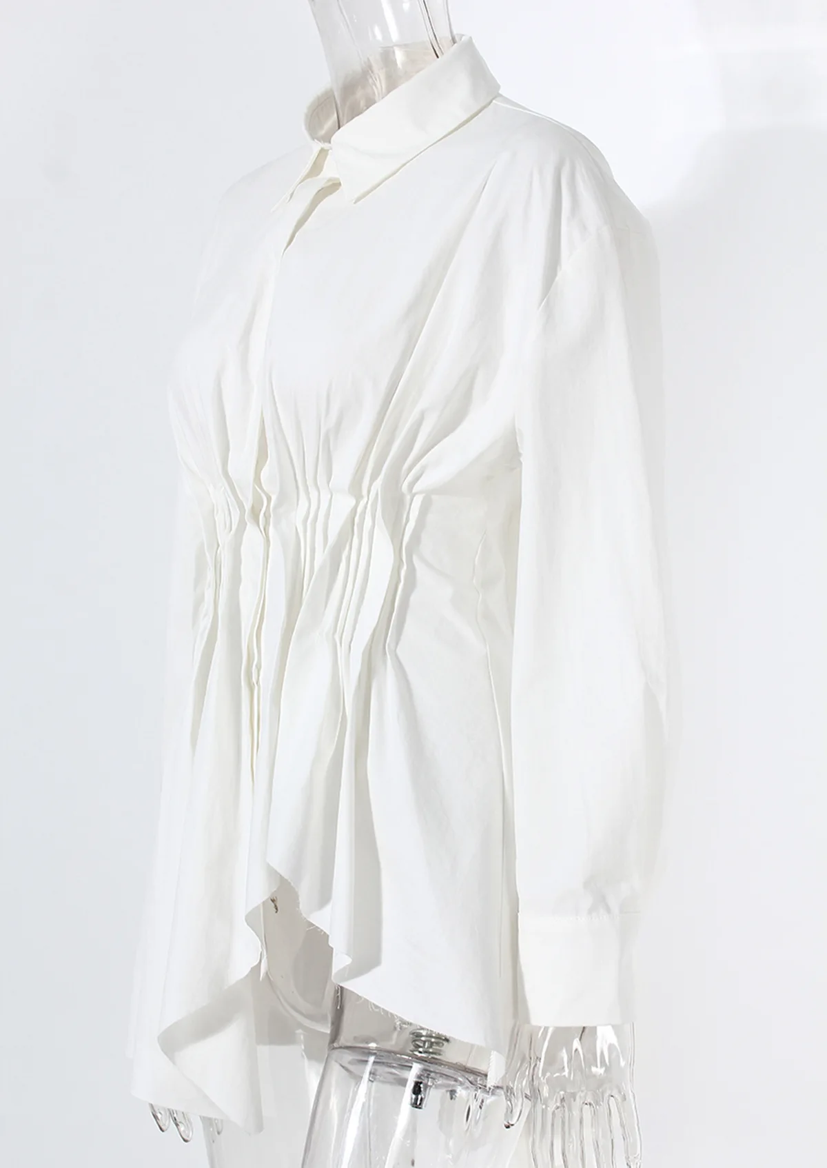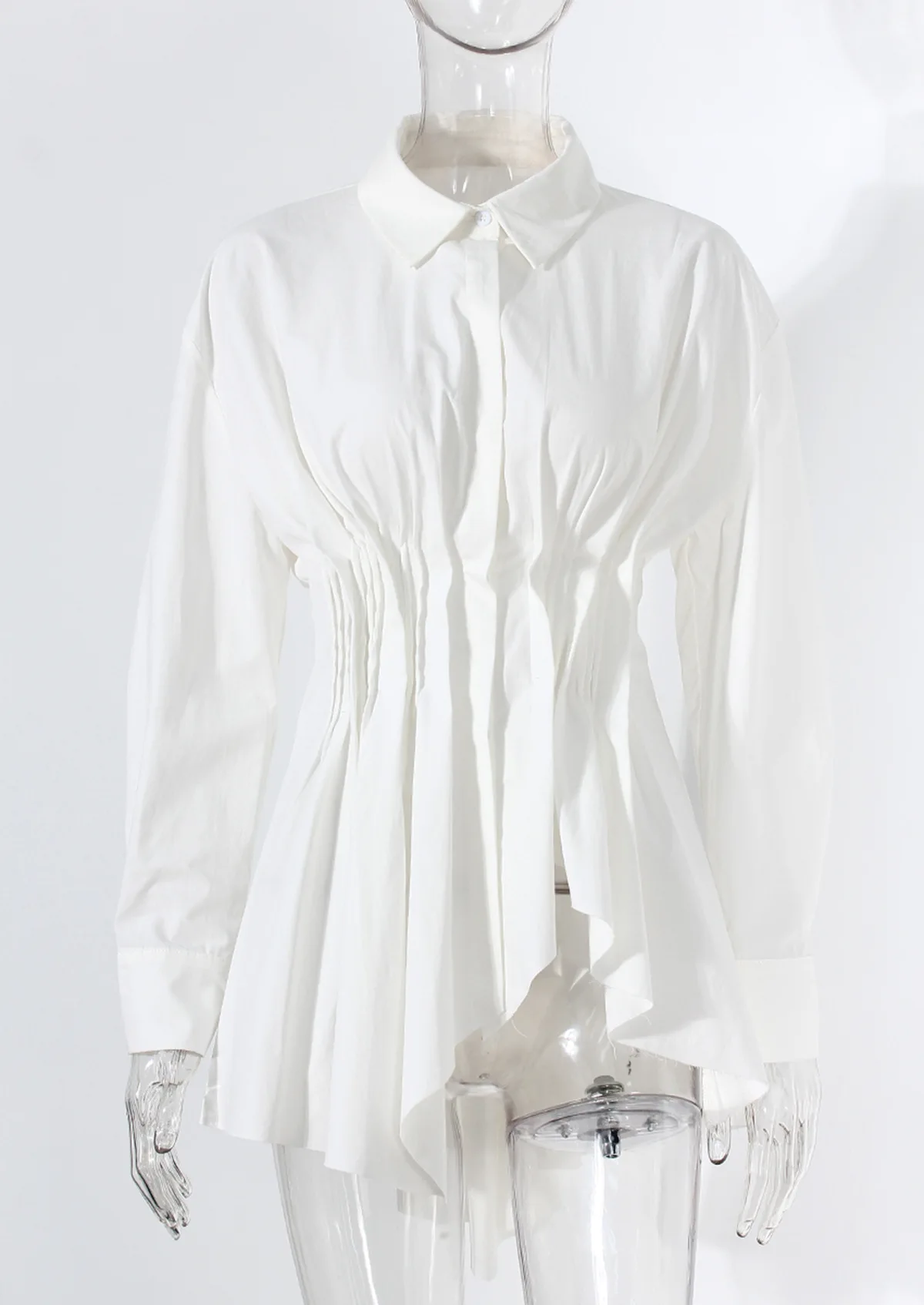Ce chemisier à ourlet en queue de poisson avec boutons recouverts est une chemise décontractée élégante en tissu large avec un mélange de coton et de polyester. Il présente un motif uni, une coupe régulière et une épaisseur standard avec une légère élasticité pour plus de confort. Le chemisier a un ourlet en queue de poisson unique, un col rabattu et des manches longues. La fermeture à boutons recouverts ajoute une touche décorative subtile, ce qui en fait un choix polyvalent pour un usage quotidien.