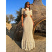 Robe longue ajourée à col roulé et manches à pompons en dentelle à taille nue