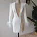 Entrez dans la sophistication avec notre robe de mariée chic et moderne. Cette luxueuse robe à col en V, confectionnée en crêpe de soie fin, présente d'élégantes manches évasées et une silhouette fourreau jusqu'aux genoux. Le design dos nu est orné de plumes et de ceintures et d'un soutien-gorge intégré pour plus de confort. Personnalisez cette robe à manches longues pour créer votre look moderne parfait.
