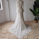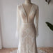 Robe de mariée sirène vintage avec un style bohème, un décolleté en V, des manches évasées, une traîne à balayage/pinceau, une silhouette longue au sol, un design dos nu, un tissu en dentelle, des décorations de boutons et de dentelle, un soutien-gorge intégré, un élément de mode vintage, des options personnalisables disponibles, adapté aux silhouettes sirène/trompette avec une taille naturelle.