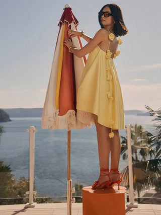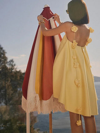 Design: A charming beach dress featuring a delicate 3D floral ribbon halter design and a playful hollowed-out detail. The slim silhouette and knee-length cut offer an elegant yet effortless summer vibe.