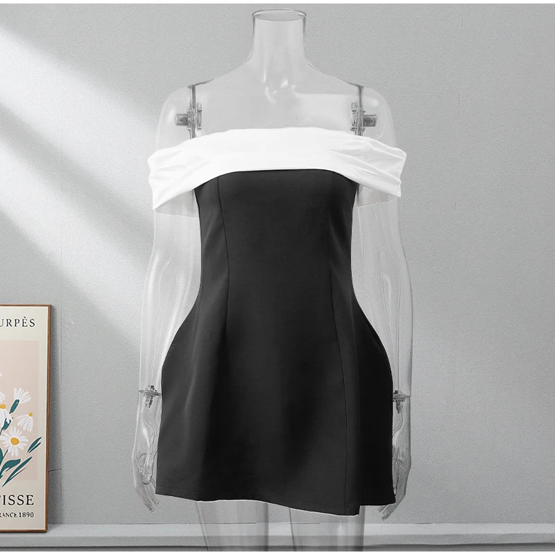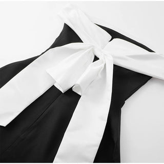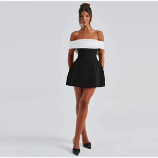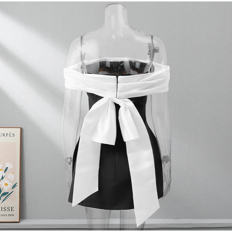Sexy off-shoulder mini dress featuring a big back bow decoration, square collar, sleeveless tank style, and A-line silhouette. Made of polyester with patchwork details, pullover closure, and empire waistline. Perfect for clubwear and party looks.