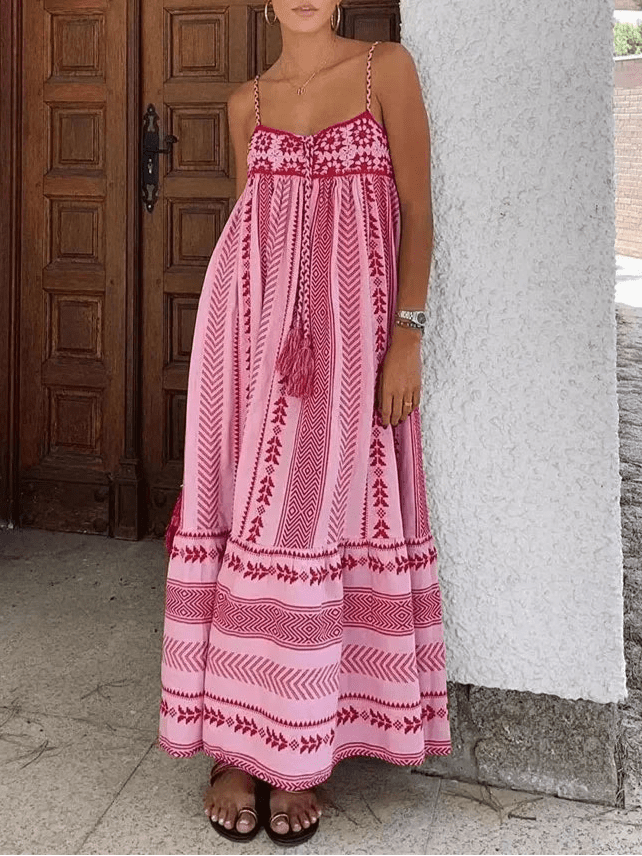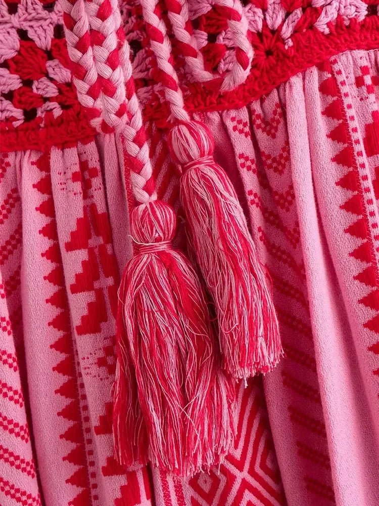 Design: A vintage-inspired bohemian knitted midi dress with a graceful A-line silhouette, floral pattern, and a relaxed fit. The sleeveless design and mid-calf length add to its effortless charm, making it a versatile piece for warm-weather styling.
