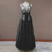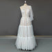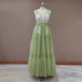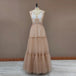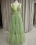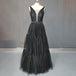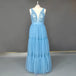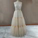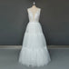 Design: Tulle A-line dress with deep V-neckline, sleeveless, lace appliques, tiered pleats, backless design, natural waistline