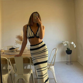 Design: A stylish 2-piece set featuring a backless bustier top with a V-neckline and a high-waist A-line skirt. The set’s striped pattern and spliced design add a modern twist, perfect for creating a chic high-street look.