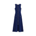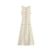This chic knitted midi dress is designed with golden buttons that add a touch of elegance to the casual style. The dress has medium stretch, offering a comfortable fit with a regular, straight silhouette. Featuring an O-neck neckline and a single-breasted closure, it provides a polished yet relaxed look. Made from high-quality polyester with a knit fabric type, the mid-calf length and sleeveless design make it ideal for versatile wear, from casual outings to more formal settings. The solid pattern enhances the minimalist, sophisticated appeal of the dress.