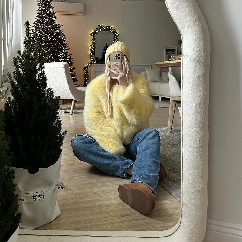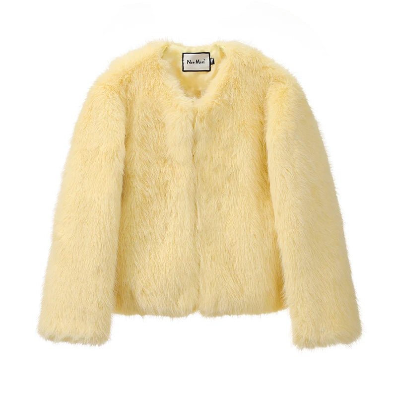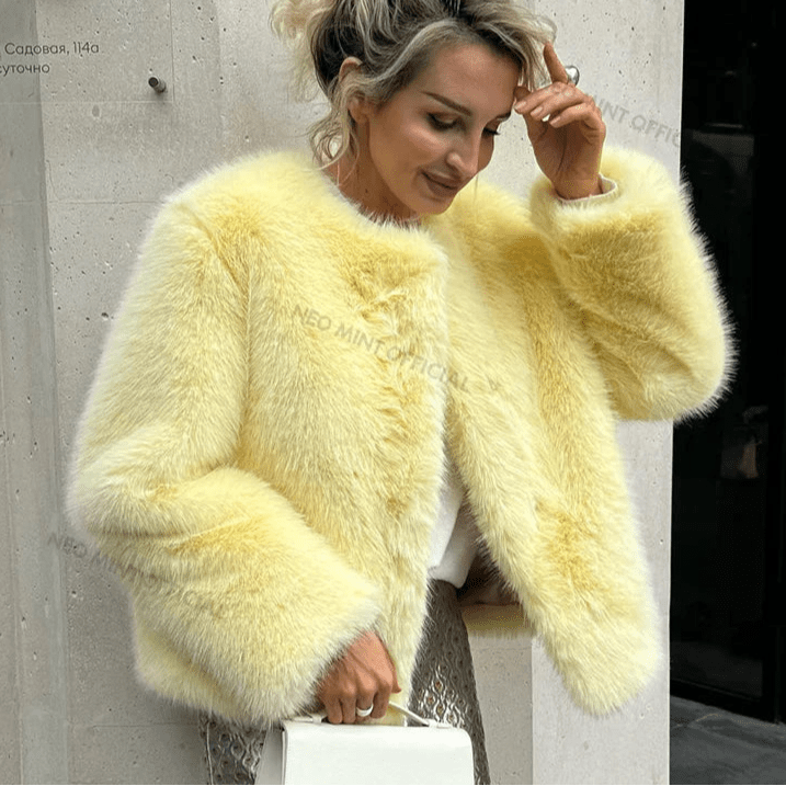 Design: Fluffy fox-inspired faux fur coat with a round neck, vintage-style pockets, and a wide-waisted streetwear fit.