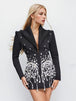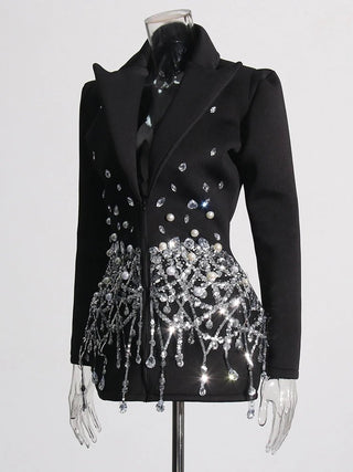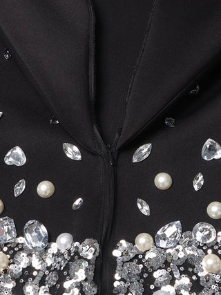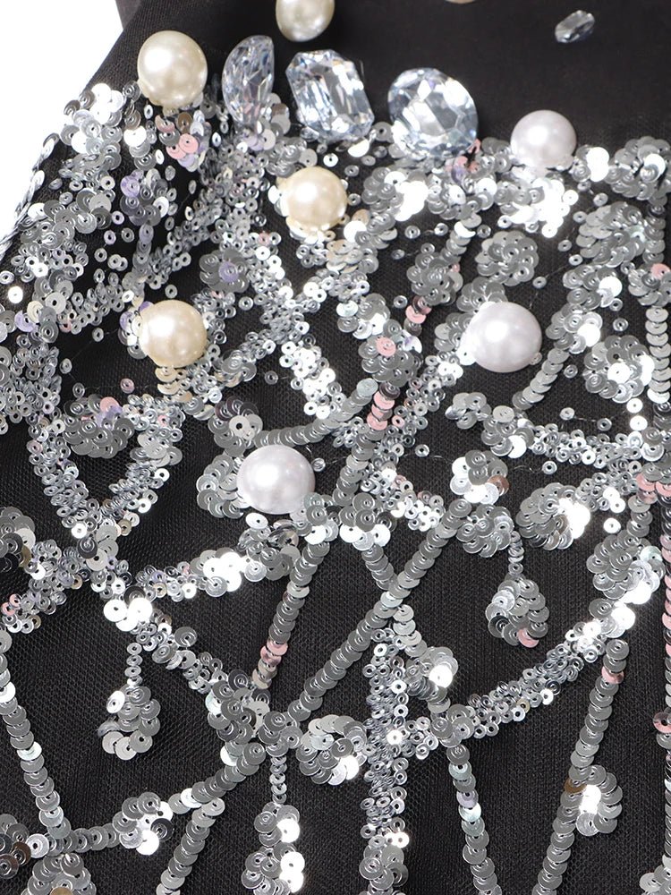 Design: A chic patchwork diamonds dress featuring a turn-down collar, long sleeves, and a high waist. The dress is embellished with sparkling sequins and diamonds, creating a glamorous and sophisticated look perfect for any special occasion.