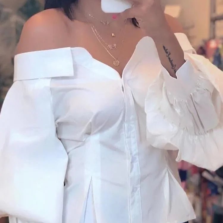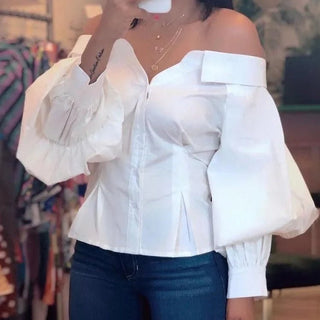 Design: A chic and elegant white blouse featuring a slash neck design with ruched detailing and lantern sleeves. The single-breasted closure and straight pattern create a flattering, sophisticated look, making it perfect for both casual and club-style occasions.