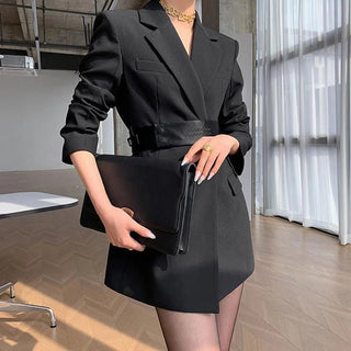 Design: This chic slim-fit suit dress features a stylish blazer with a notched neckline and a flattering A-line silhouette. The dress is paired with a belt, accentuating the empire waistline for a sophisticated office look. The single-breasted closure completes the polished appearance, perfect for professional settings.