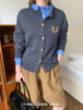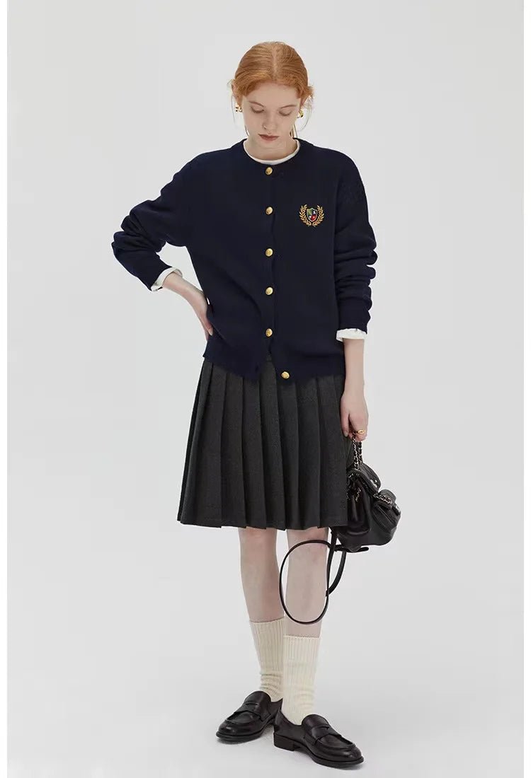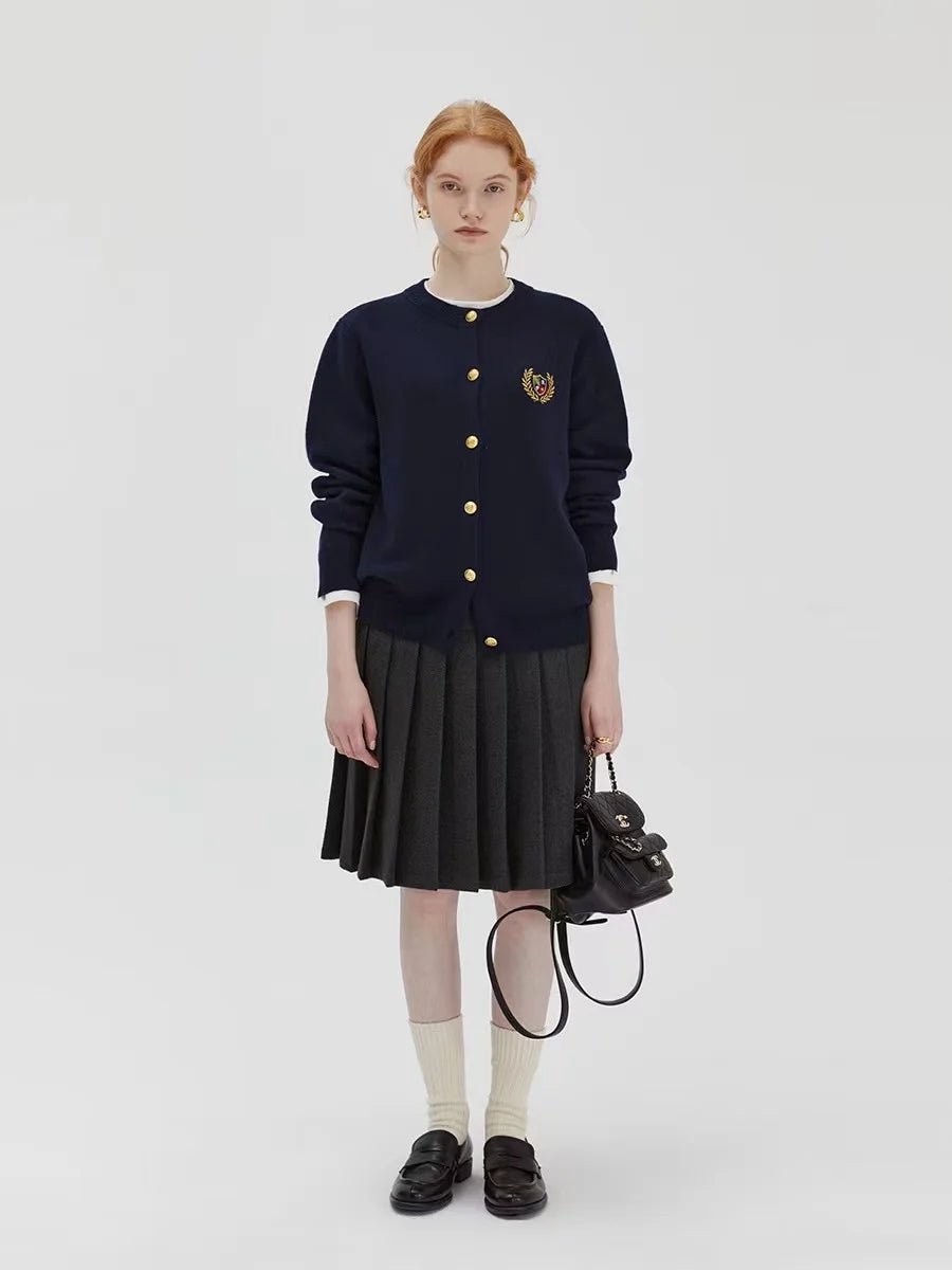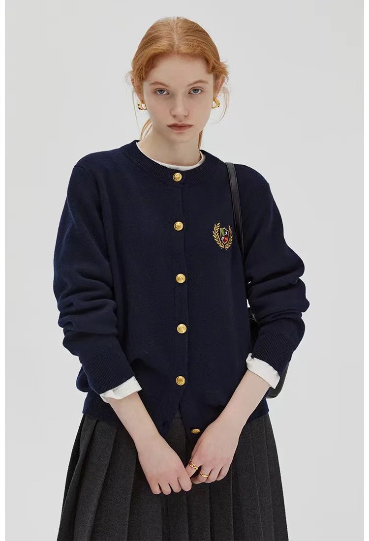 Design: A chic cashmere cardigan featuring a round neck, open-stitch closure, and full sleeves for an elegant office-lady style. The striped pattern and delicate embroidery add a touch of sophistication.