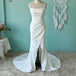 Embrace timeless elegance with our Classic Mermaid Wedding Dress. This simple, strapless gown features a backless design and a court train for a dramatic touch. Crafted from thin crepe silk with a criss-cross decoration, this floor-length dress includes a built-in bra for comfort. Customize this sleeveless, spaghetti strap silhouette to achieve your perfect fit.