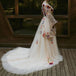 A captivating V-neck gown featuring full batwing sleeves and a floor-length silhouette with a sweeping train. Adorned with intricate embroidered lace on net and vibrant floral decorations, this A-line dress offers a unique and colorful touch. The back is designed with a zipper closure, and the waistline sits naturally. Perfect for a stunning wedding photoshoot, this dress is fully customizable to fit your vision.