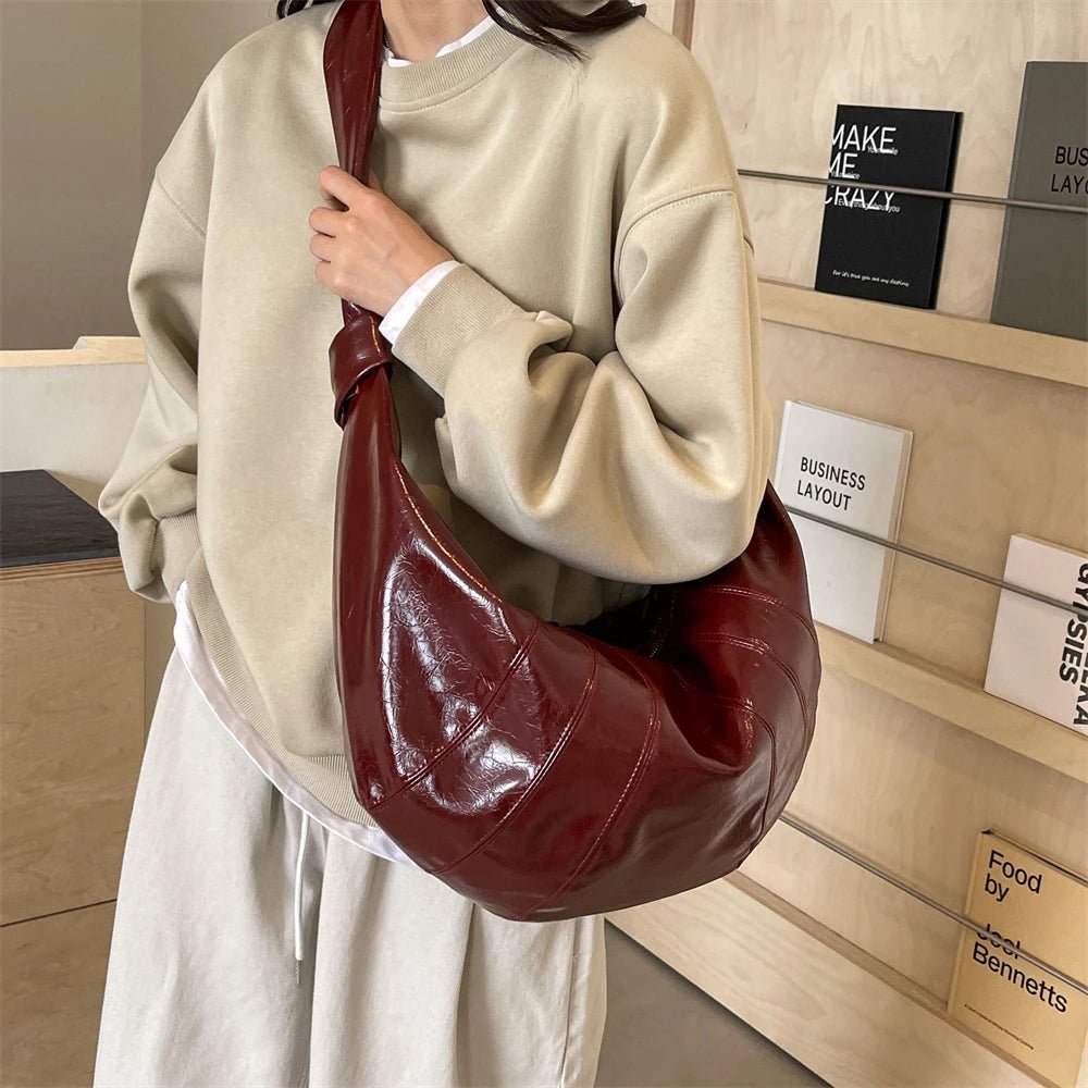 Design: A contemporary crescent-shaped shoulder bag featuring a sleek half-moon silhouette, a spacious interior, and an adjustable strap for versatile carrying options.