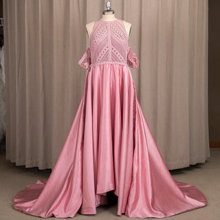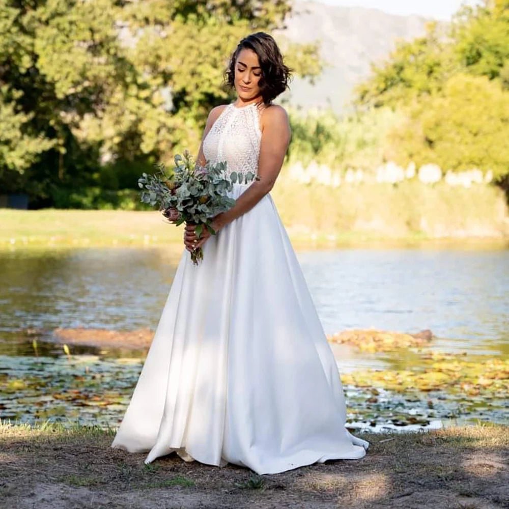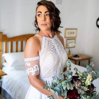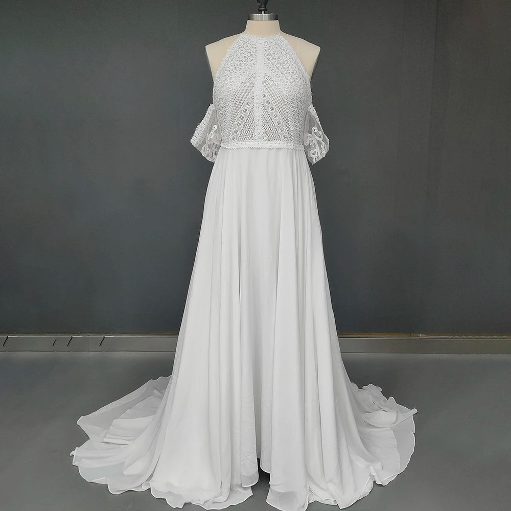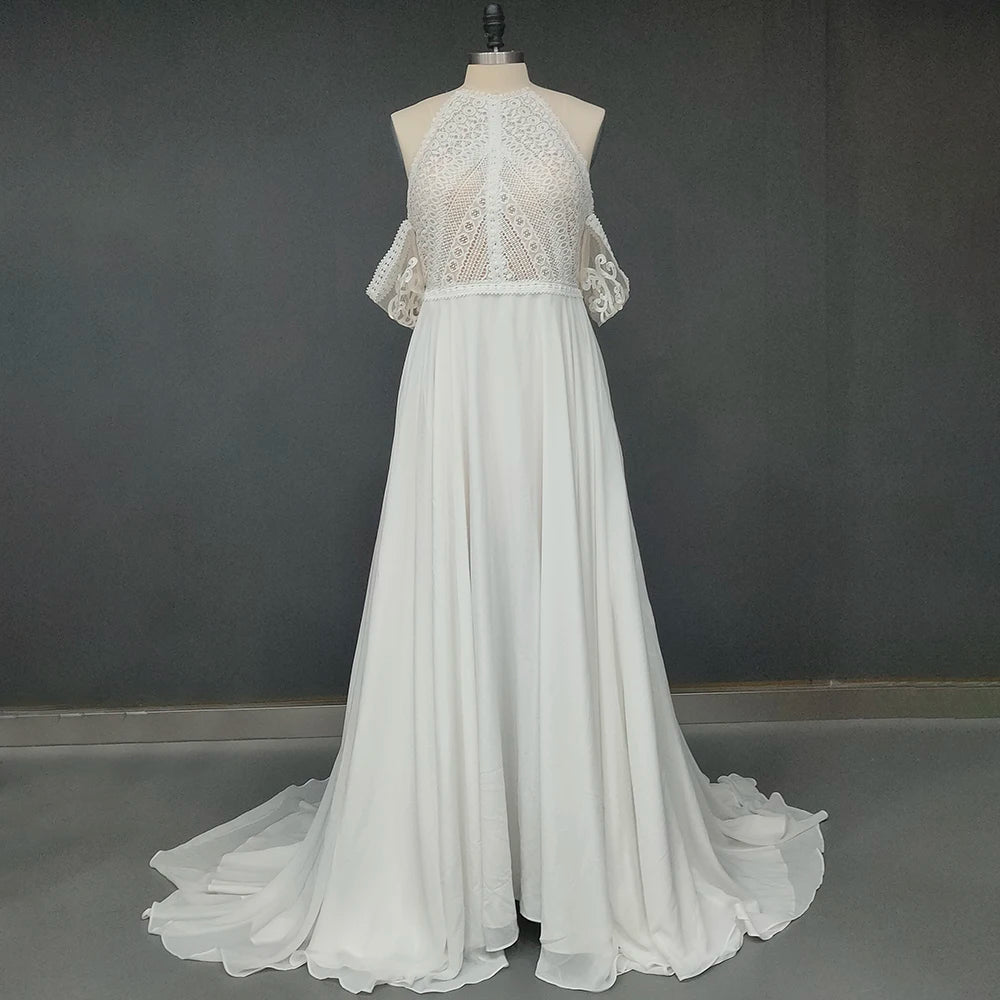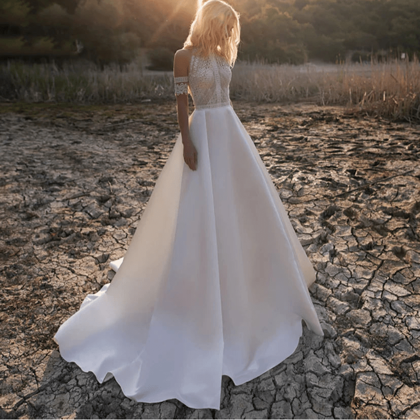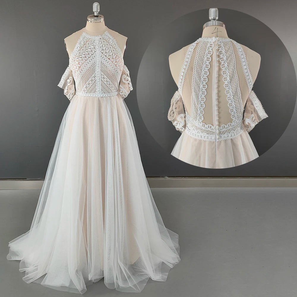 Design: A boho-inspired A-line wedding dress featuring a flattering halter neckline, short sleeves, and an illusion back design. The intricate lace and pearl details bring a vintage charm to the modern silhouette, making it the perfect balance of elegance and effortless beauty.