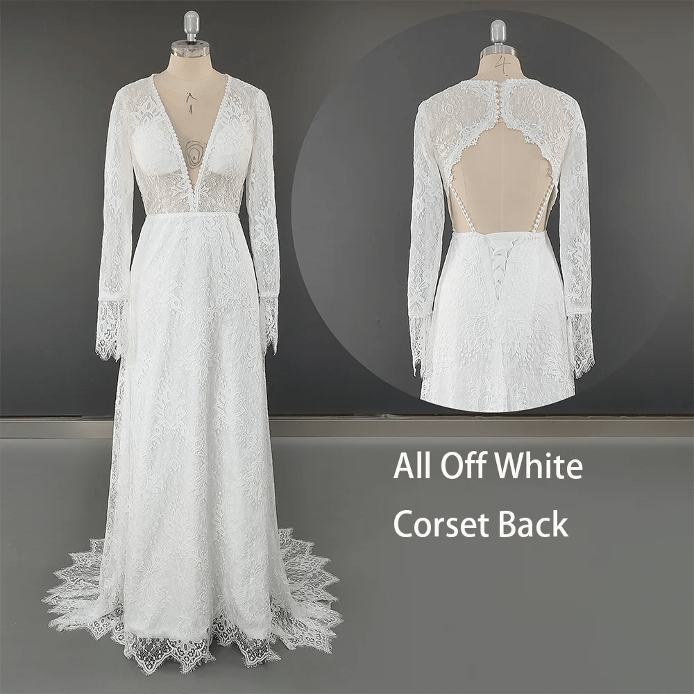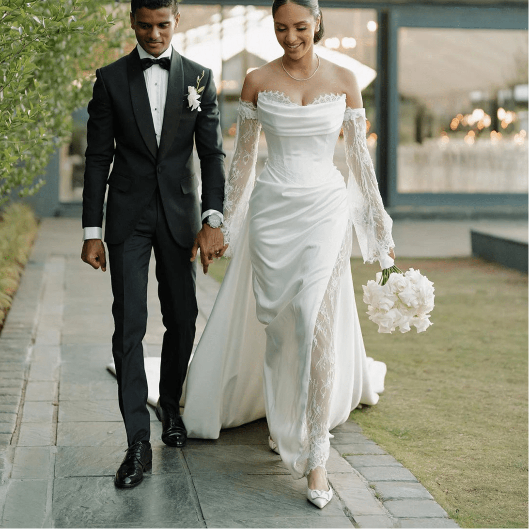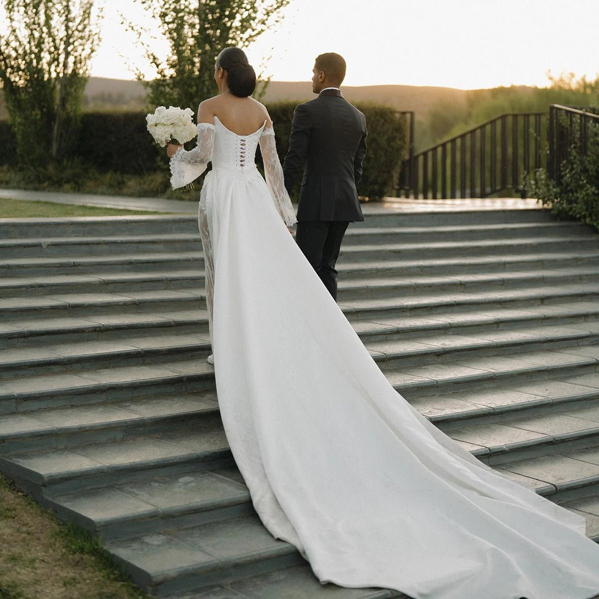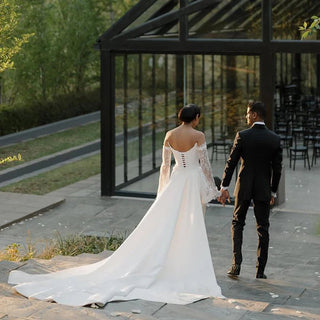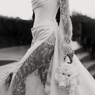 Design: A simple yet elegant sheath wedding dress featuring a romantic sweetheart neckline, full-length sleeves, and a sophisticated button-back design. The detachable overskirt adds versatility, allowing for two distinct bridal looks in one. Delicate lace detailing enhances the timeless beauty of this floor-length gown.