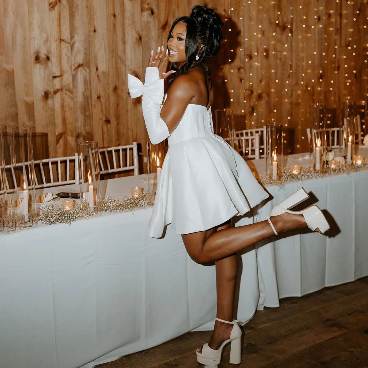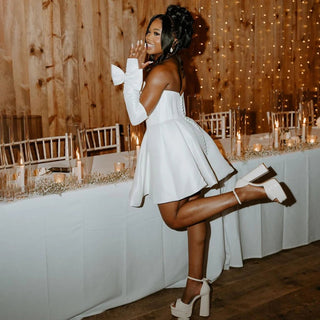 Design: A simple strapless wedding dress featuring a draped satin bodice, elegant button-back design, and a flowing A-line silhouette. The soft satin fabric adds a touch of timeless sophistication.