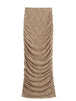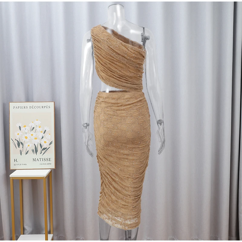 Elegant Glitter Pleated Midi Skirt Set, perfect for spring and summer. This stylish set features a solid-patterned, ankle-length pleated skirt made from a blended fabric, ensuring a lightweight and comfortable fit. The top showcases a chic slash neck design and full sleeves, with a pullover closure for easy wear. The straight silhouette and elastic waistband of the skirt provide a flattering look, making it ideal for both casual outings and special occasions. Crafted from synthetic fibers and free of high-concern chemicals, this set combines elegance and comfort effortlessly.