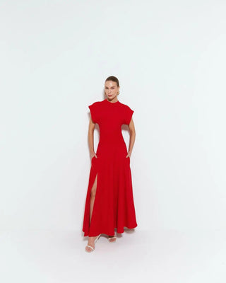 Design: Stunning ankle-length red gown featuring a half high collar, padded shoulders, and a slim bodycon silhouette with a chic side split. Full-length sleeves and single-breasted button closure complete the elegant and bold look.