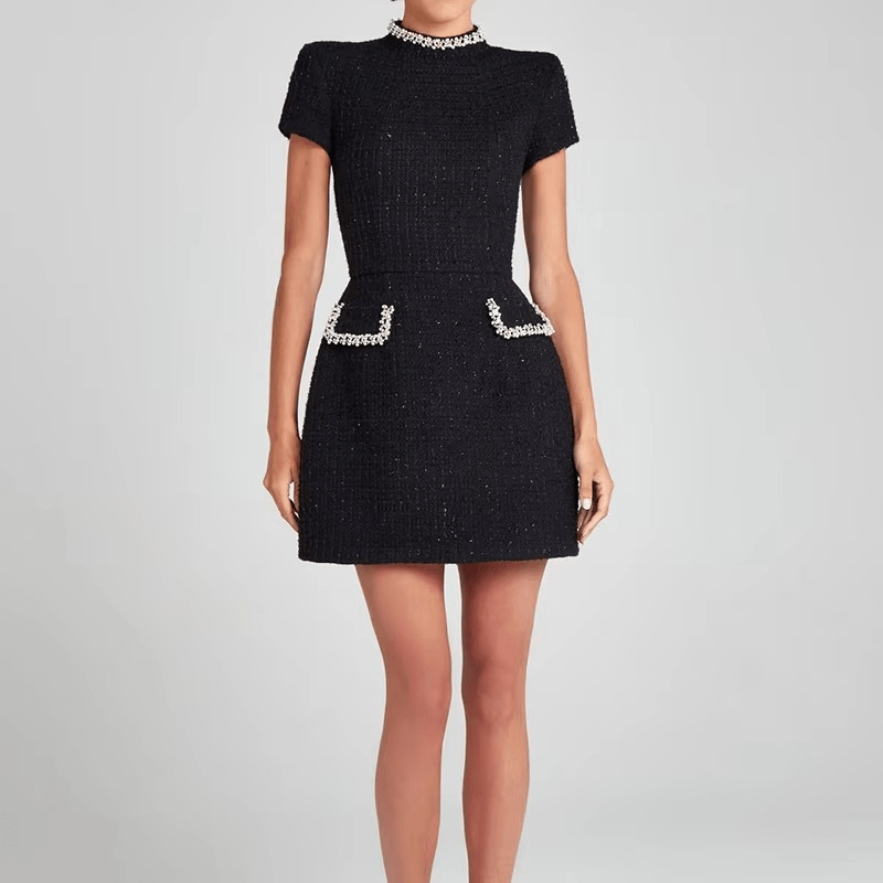Design: Chic A-line silhouette with a high waist, round neckline, and structured short sleeves featuring subtle shoulder padding for a polished look.