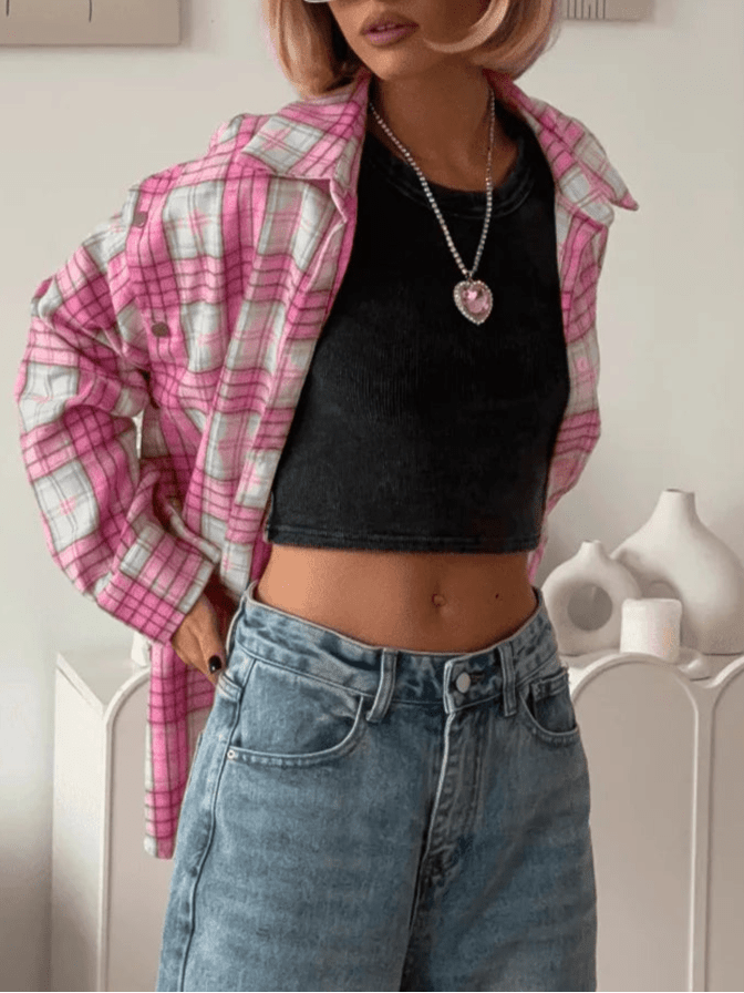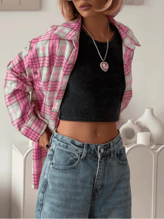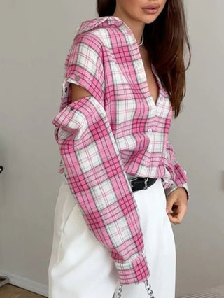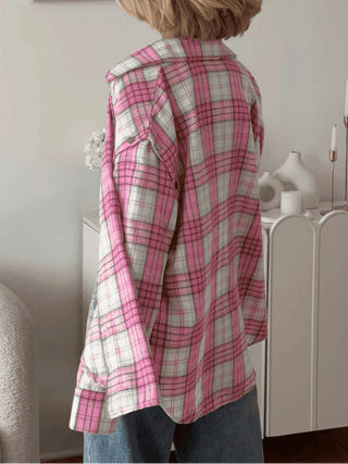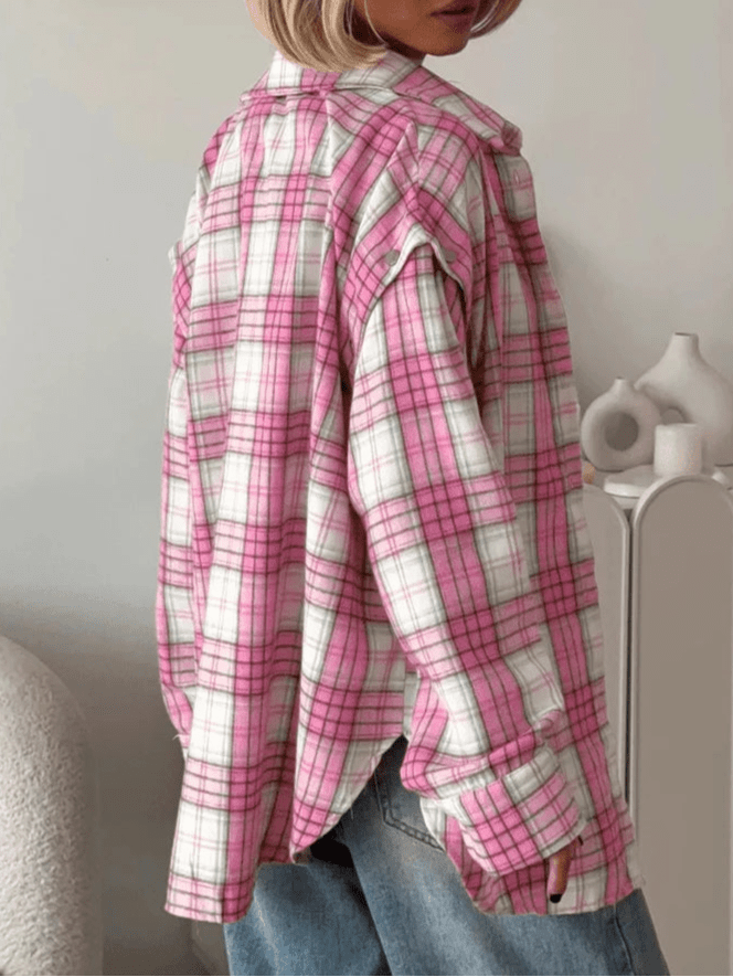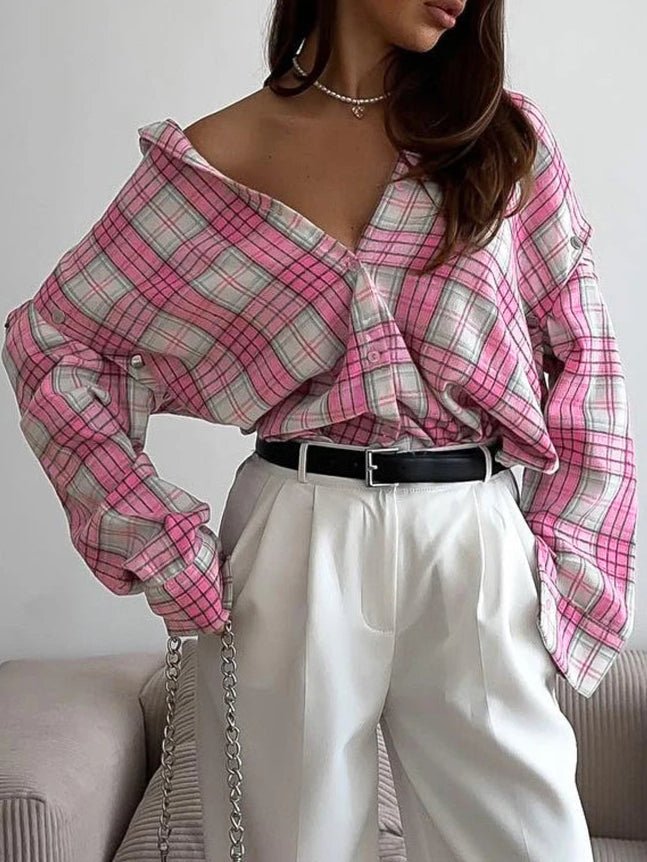 Design: An elegant plaid blouse featuring a turn-down collar, single-breasted closure, and a relaxed silhouette. The timeless pattern and structured fit add a polished touch to any outfit.