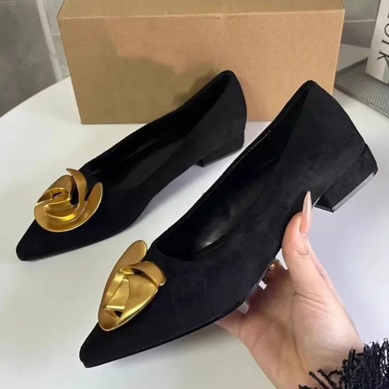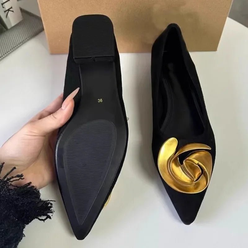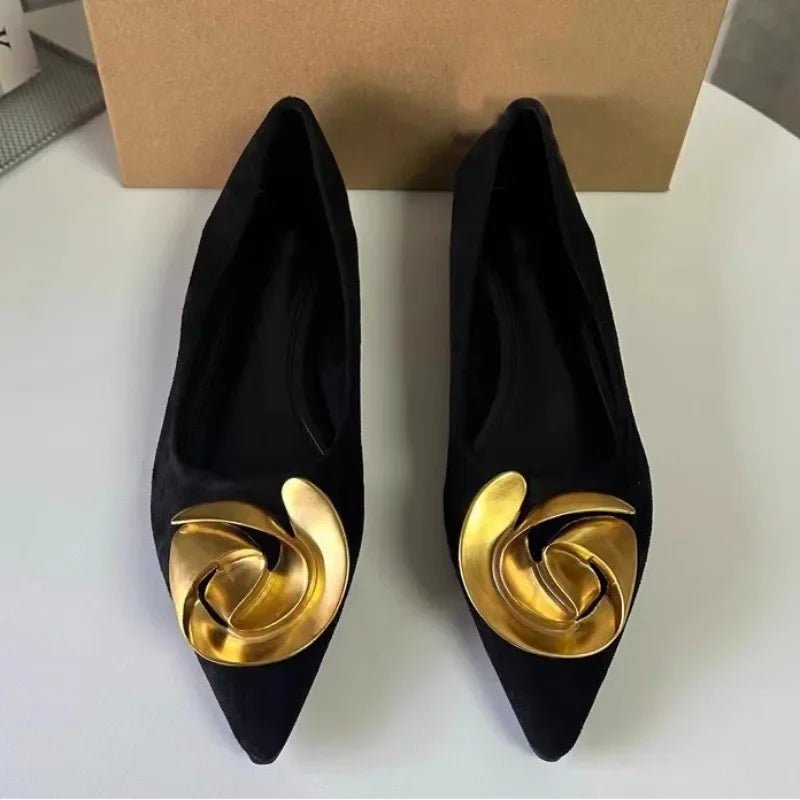 Design: Pointed-toe summer flats for women with flock upper, metal flower decoration, and slip-on design. Solid pattern with PU lining and rubber outsole.