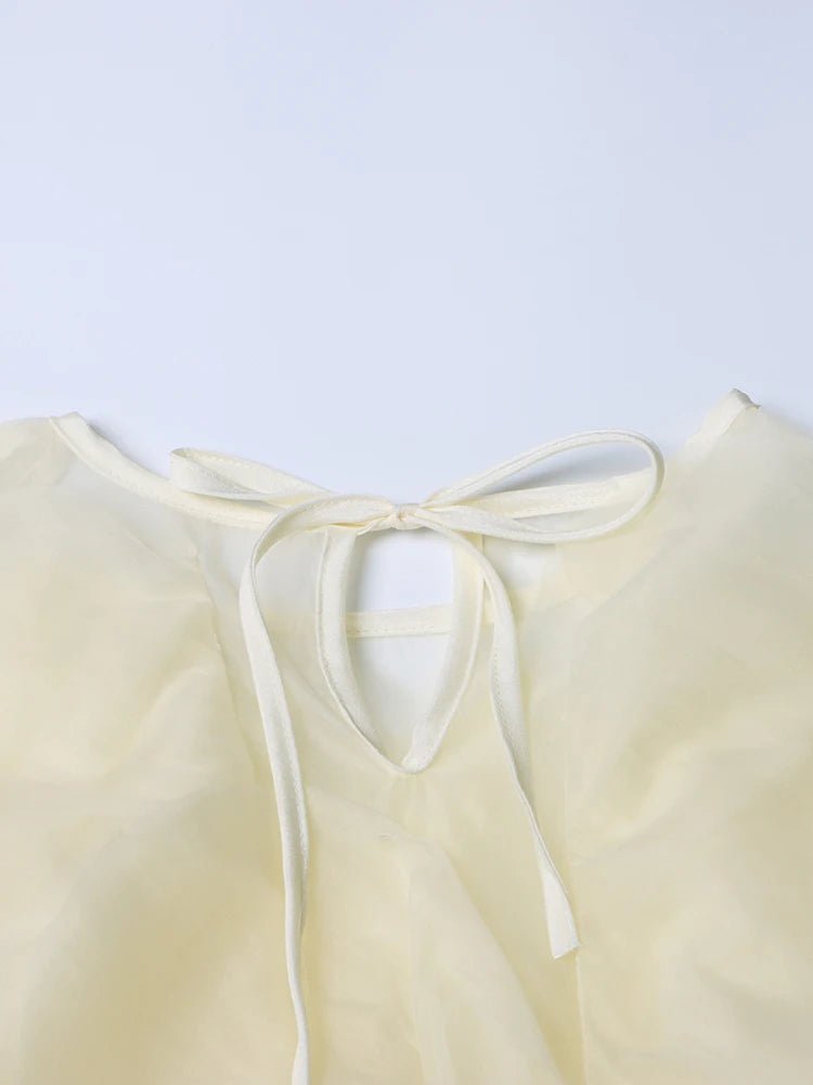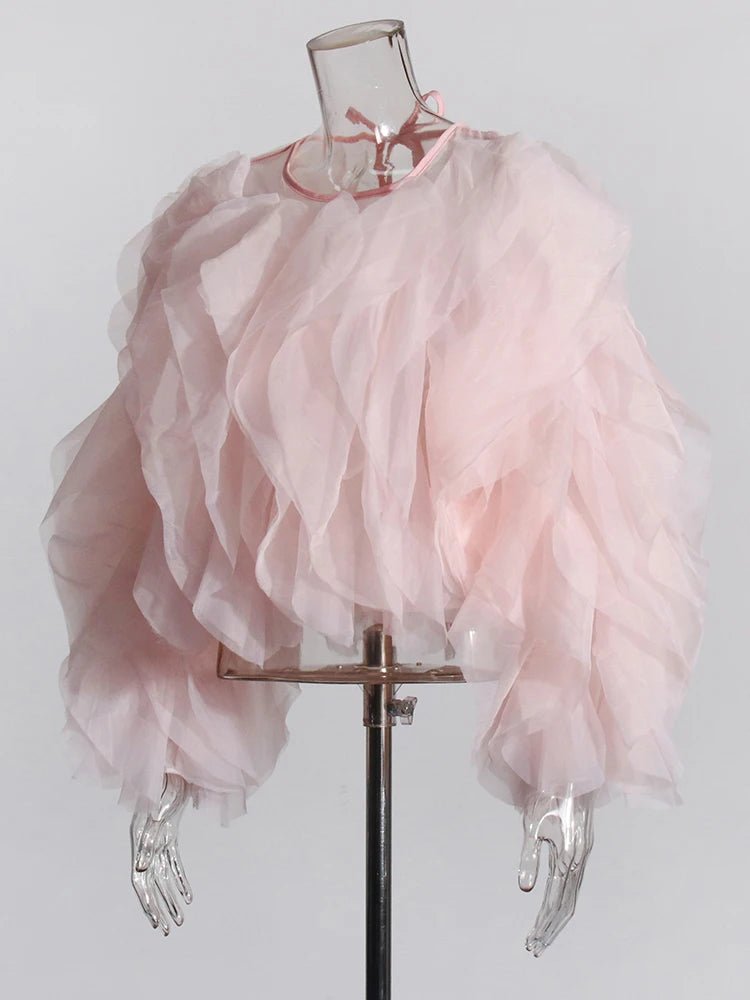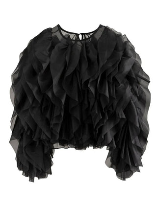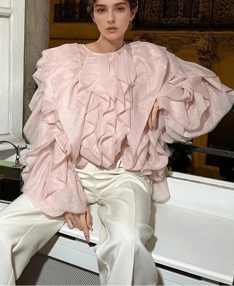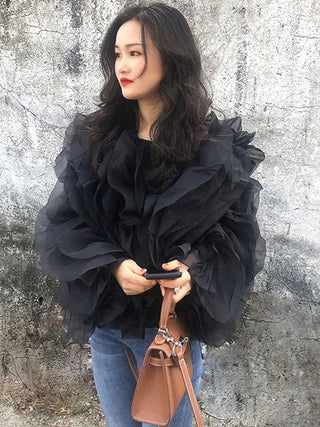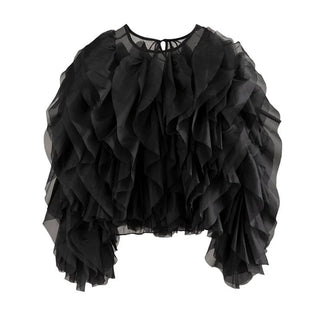 Design: A breezy and romantic chiffon blouse featuring delicate patchwork details, soft ruffle accents, and elegant lantern sleeves. The relaxed silhouette and O-neckline create an effortlessly graceful look.