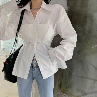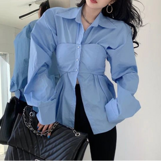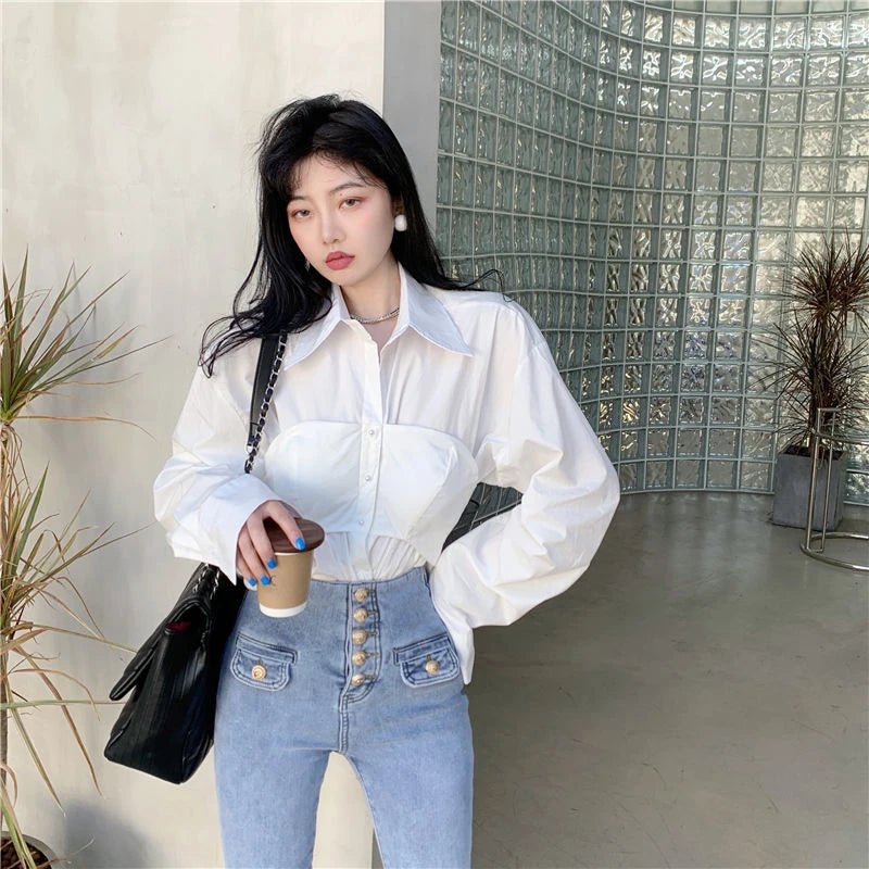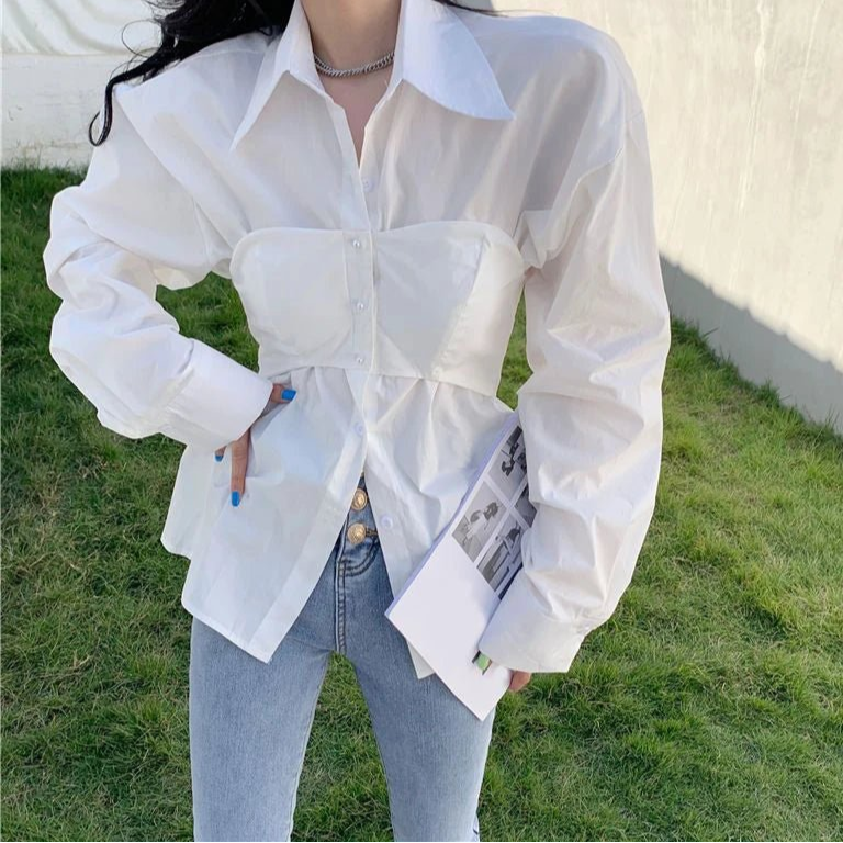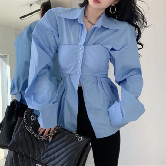 Design: A sleek and stylish long sleeve top featuring elegant patchwork details. The turn-down collar and single-breasted closure give it a classic look, while the slim fit adds a modern touch perfect for streetwear.