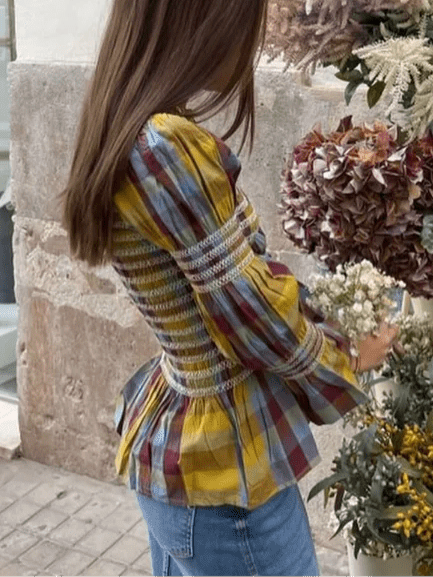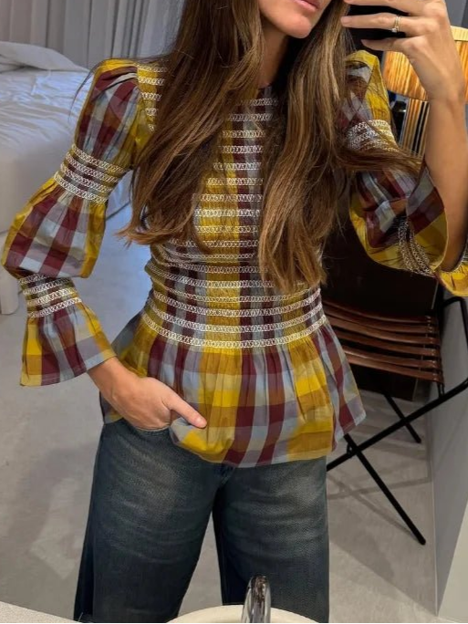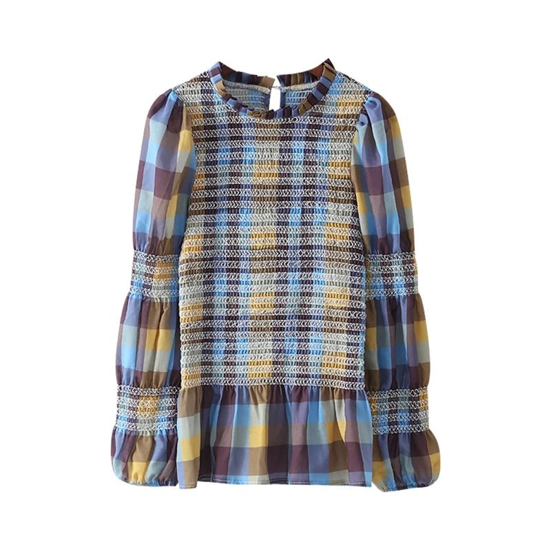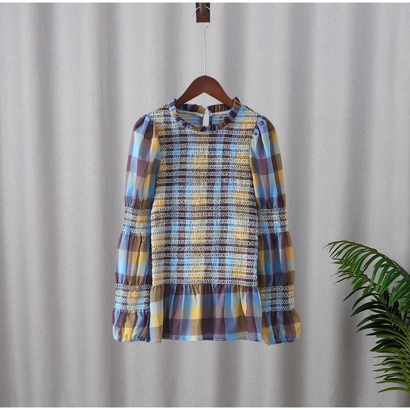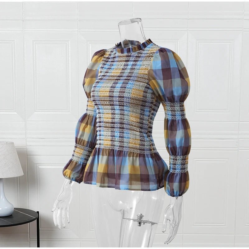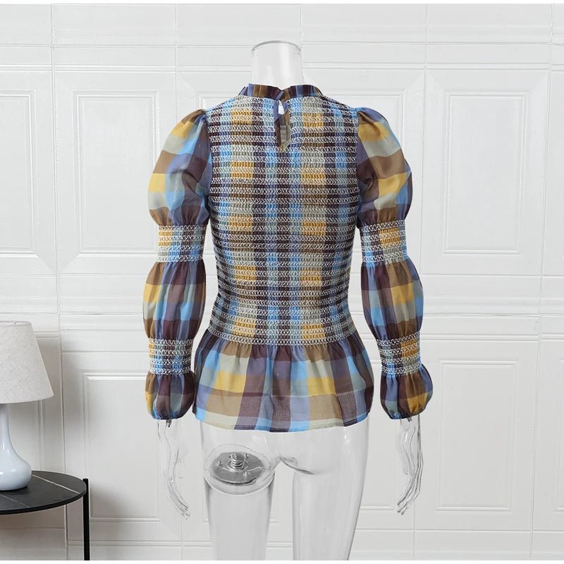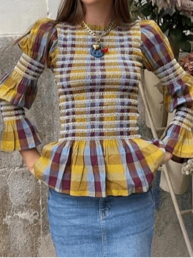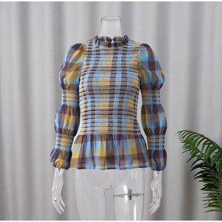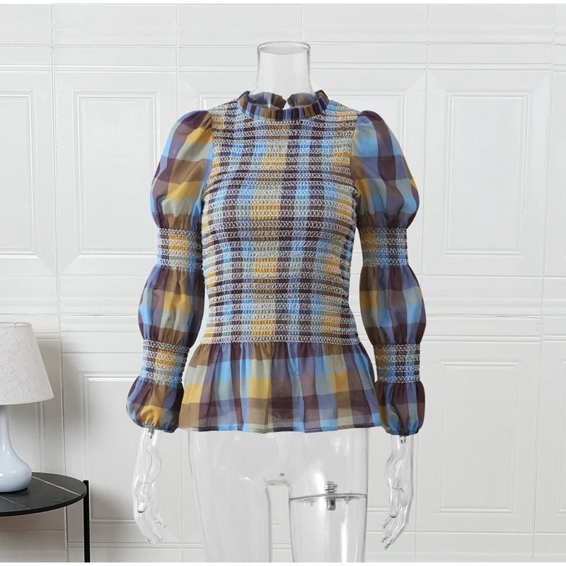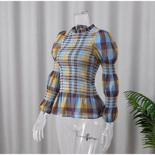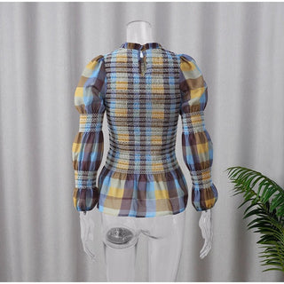 Design: Chic plaid printed puff sleeve top featuring an O-neck and ruffle hem for a playful, elegant silhouette. The classic plaid print adds a timeless, stylish touch.