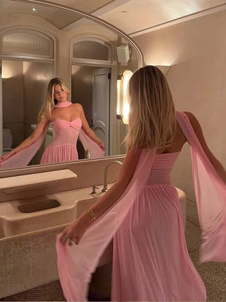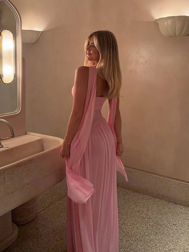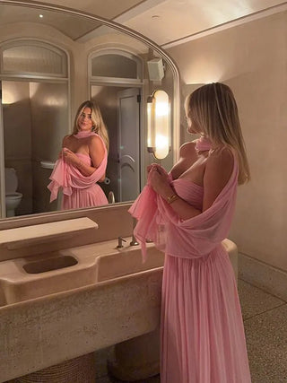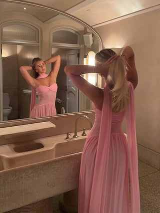 Design: Floor-length pleated A-line dress with a backless design, strapless neckline, and elegant scarf detail.